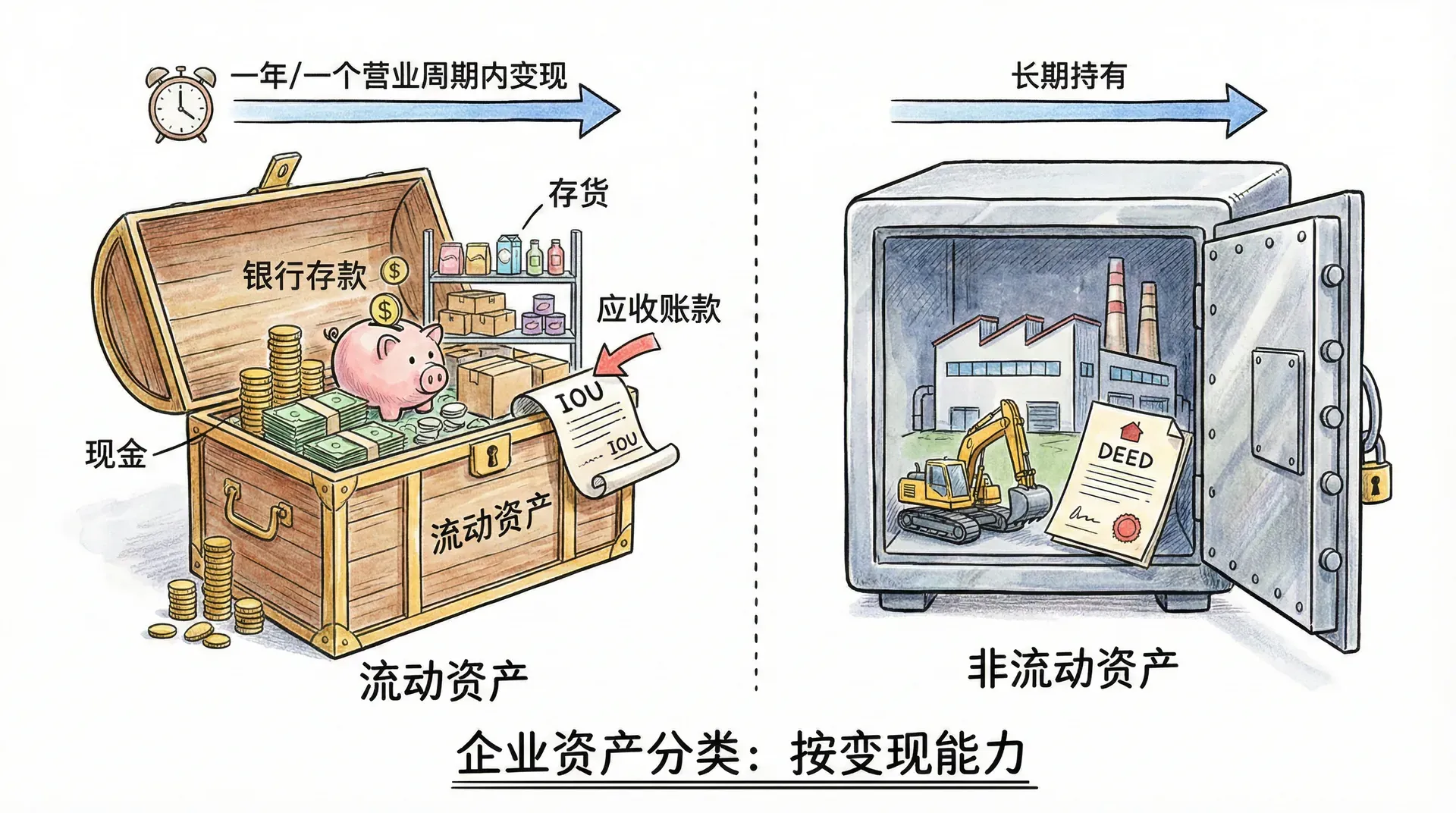 企业的资产根据变现能力可以分为“流动资产”和“非流动资产”。流动资产通常在一年或一个营业周期内可以变现、出售或耗用,代表企业短期内可以支配的资金或资源。常见的流动资产包括:现金、银行存款、应收账款、存货等。