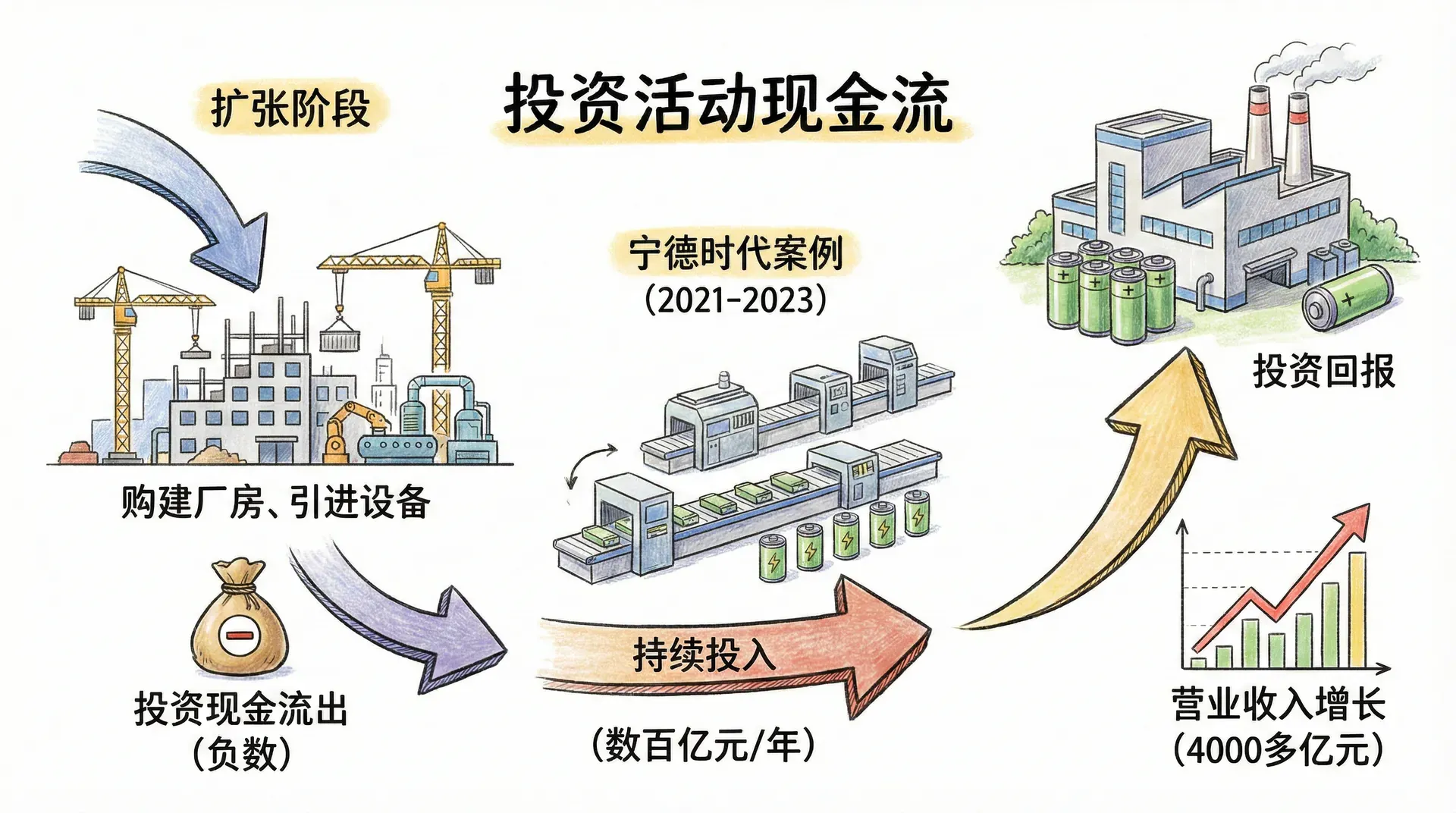 投资活动现金流反映企业因购置、处置长期资产及投资理财等活动导致的现金流入和流出。企业处于扩张阶段时,投资活动现金流多为负数,这通常意味着企业正在购建厂房、引进设备、技术升级。例如,宁德时代在2021-2023年持续加大电池产线扩建投入,每年投资现金流出高达数百亿元,营业收入也随之从2021年的1303亿元增至2023年的4000多亿元,投资取得明显回报。