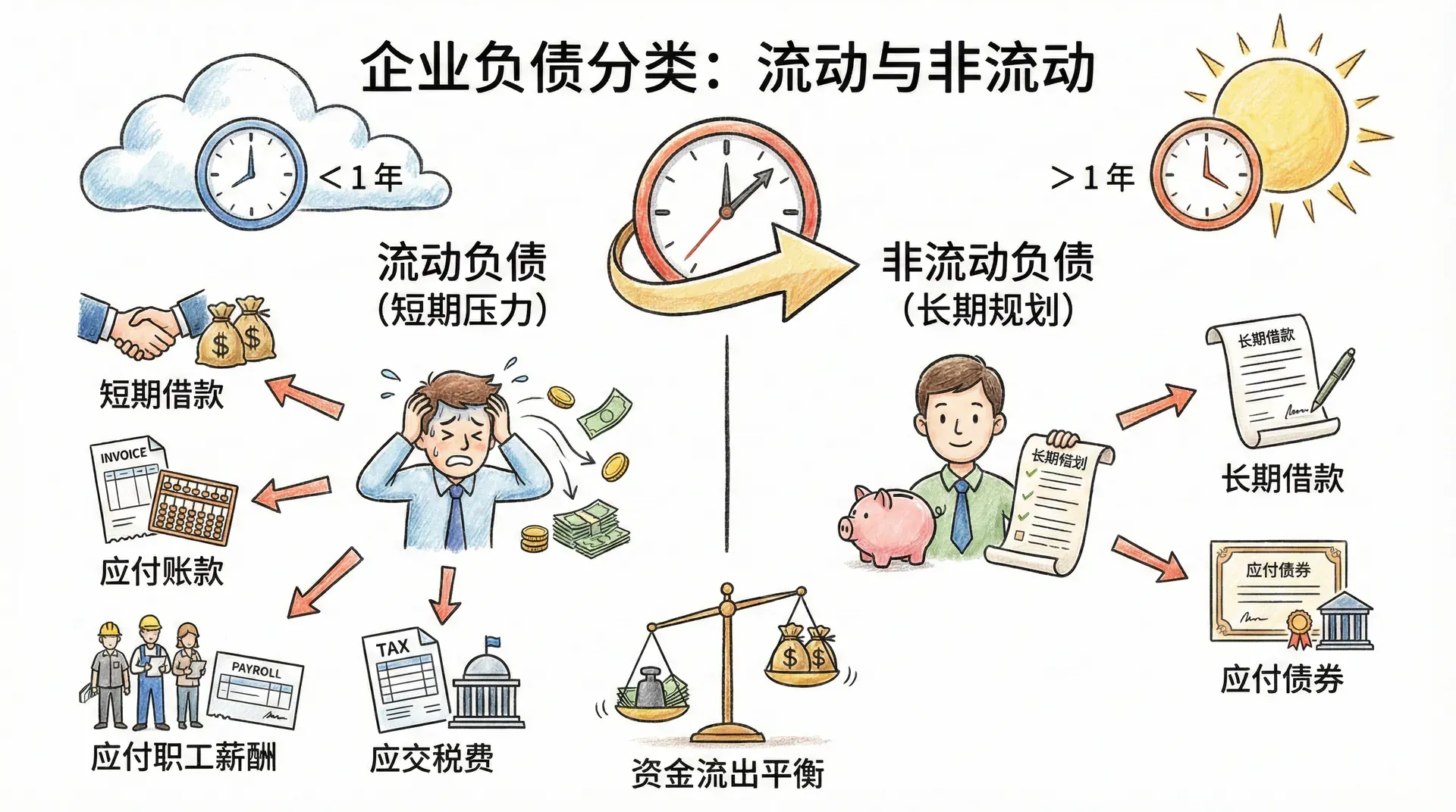 企业在日常经营中会产生各种需要偿还的债务,按照偿还期限分为流动负债和非流动负债。流动负债要求在一年或一个营业周期内偿还,代表企业近期内的资金流出压力。常见的流动负债有:短期借款、应付账款、应付职工薪酬、应交税费等。