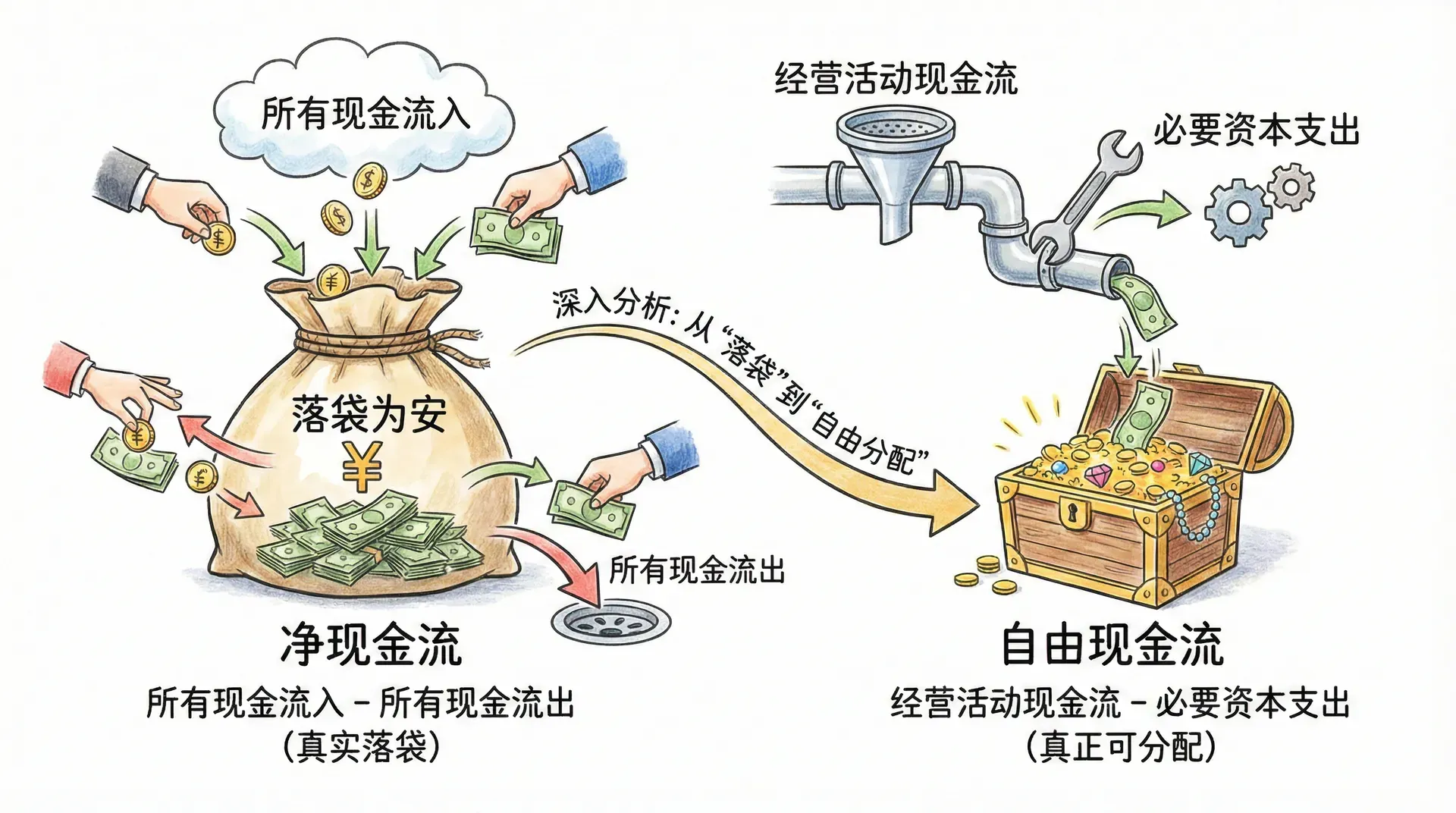 在企业财务分析中,单纯通过利润表看到的“盈利”往往掺杂了诸如应收账款、折旧、存货变动等非现金因素,而净现金流和自由现金流则是排除这些会计处理后呈现企业真实“能落袋为安”的现金。