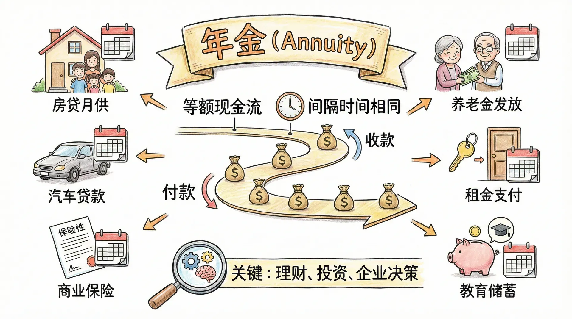 年金是由一系列等额、间隔时间相同的现金流组成的,无论是收款还是付款,都属于年金。在生活中,房贷月供、汽车贷款、商业保险、养老金发放、租金支付、教育储蓄等都属于年金。理解各类年金的特点与计算,在理财、投资及企业运营决策中极为关键。