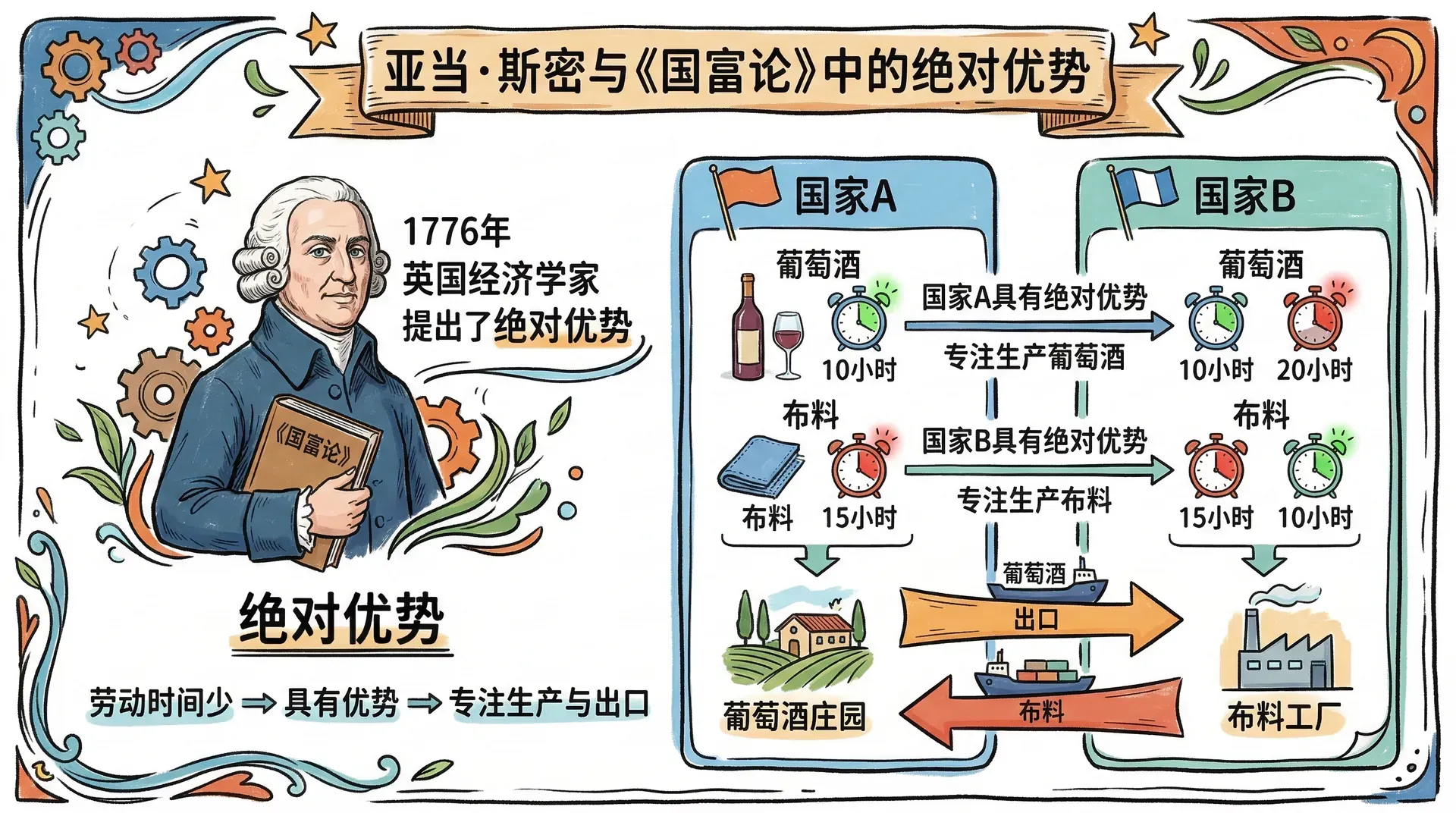 1776年,英国经济学家亚当·斯密在《国富论》中提出了绝对优势(Absolute Advantage)的概念:如果一个国家生产某种产品所用的劳动时间少于另一个国家,它就在这种产品上具有绝对优势,应该专注生产并出口这种产品。