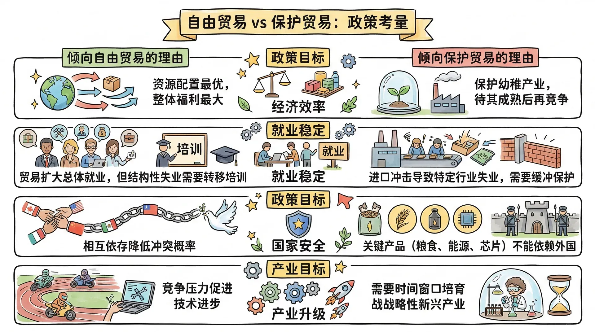读完以上内容,一个核心矛盾浮现出来:贸易理论告诉我们自由贸易对所有国家整体有利,但现实中各国政府无时无刻不在使用各种手段干预贸易。这两者并不矛盾,而是政策制定中永恒存在的张力。