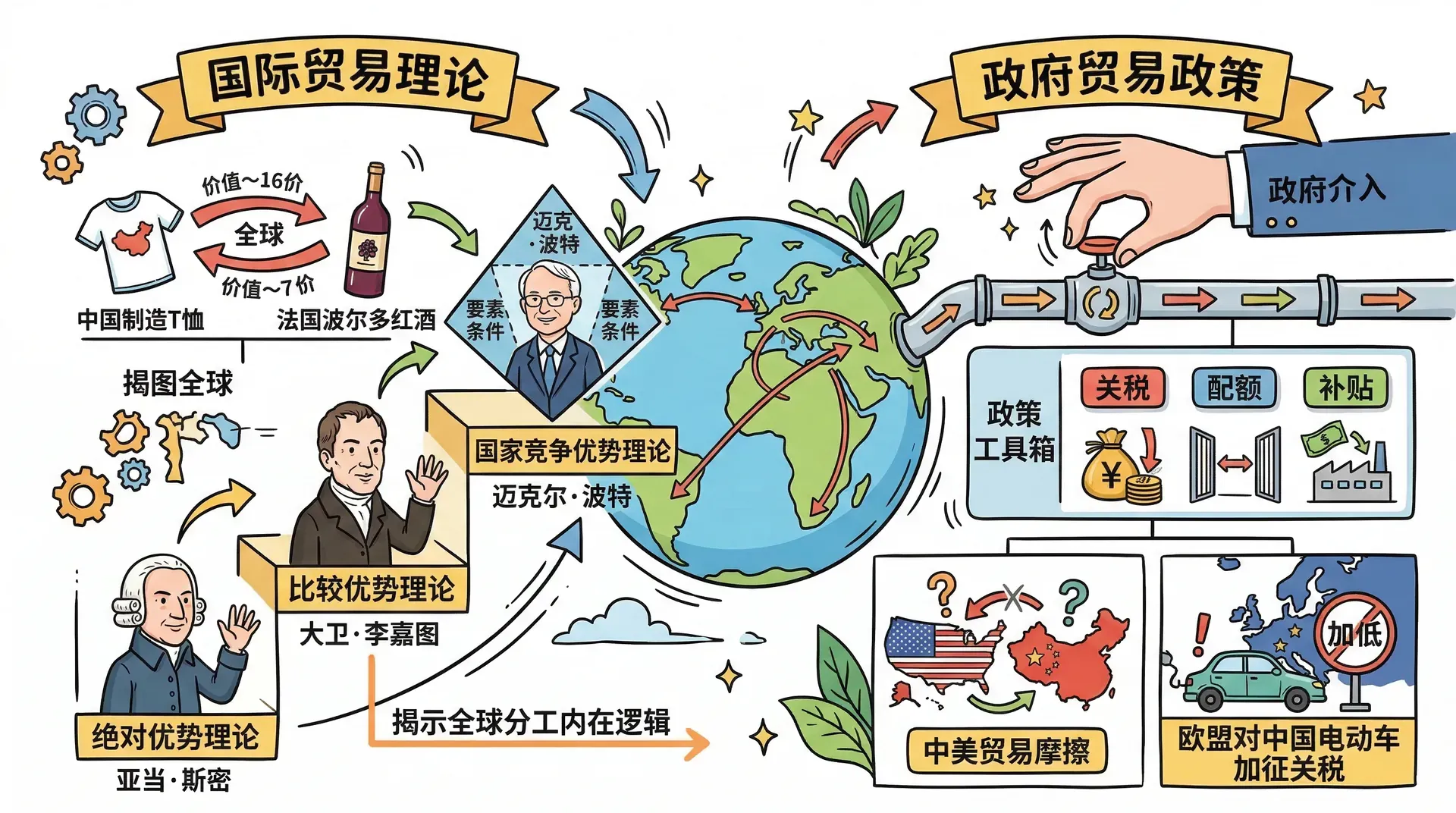从亚当·斯密的绝对优势,到李嘉图的比较优势,再到要素禀赋理论和波特的钻石模型——这一系列理论共同构成了理解全球分工逻辑的理论框架。它们解释了为什么各国会互相贸易、为什么不同国家在不同产品上有竞争优势、以及这些优势是如何随着经济发展而演变的。