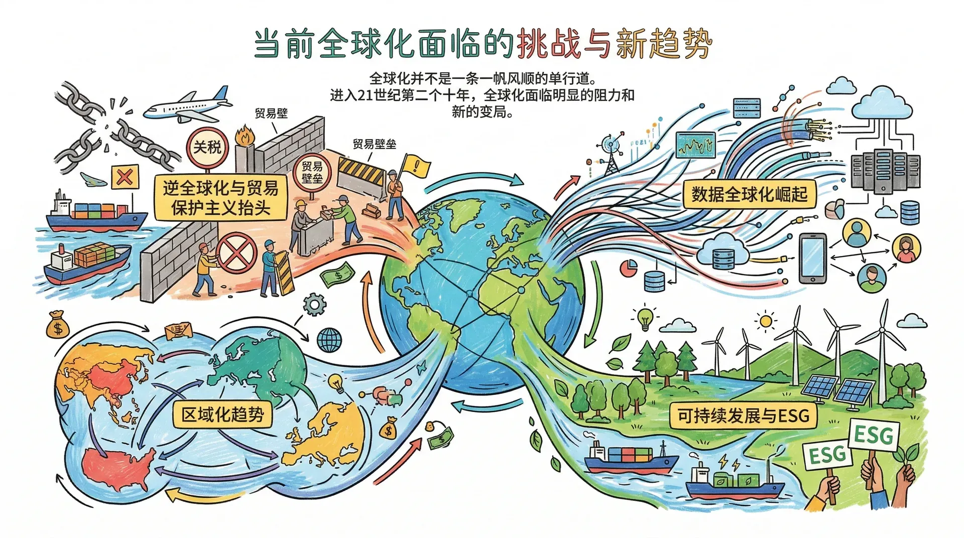 读到这里,我们从全球化的定义出发,梳理了它的历史演变、驱动力量和主要表现,进而讨论了它对企业、消费者和社会的具体影响,最后将视野拉回到当下——这个全球化与逆全球化并存、传统贸易与数字经济交织的复杂时代。
