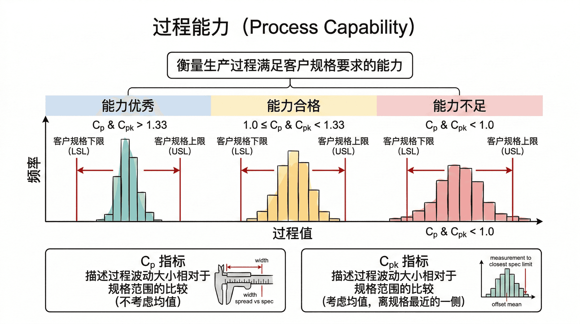 控制图告诉我们过程是否处于受控状态(即波动是否稳定)。但受控不等于合格——即便过程波动完全稳定,如果波动范围本身就很宽,产品仍然可能大量超出客户的规格要求。