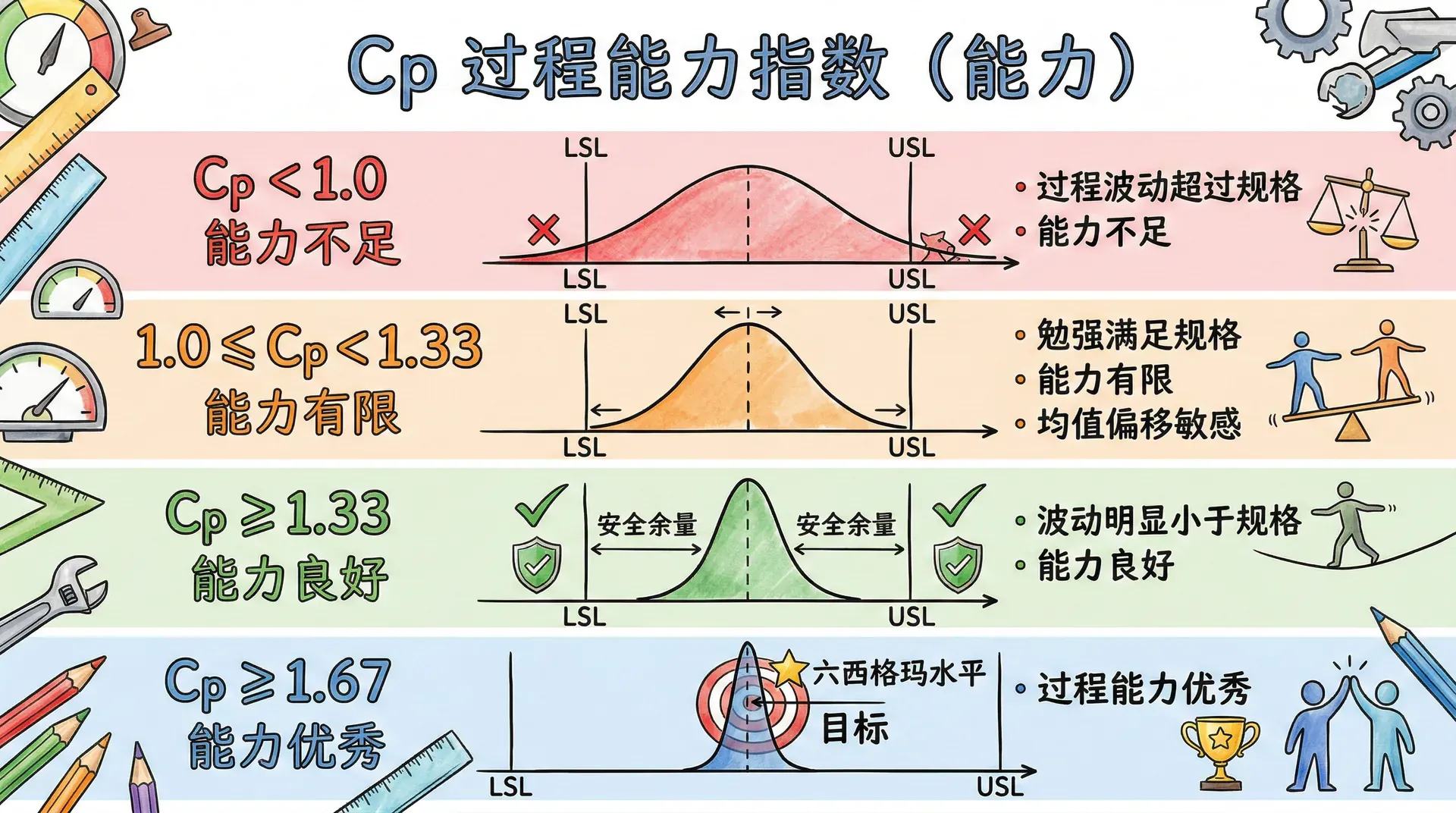 Cp(Process Capability Index)衡量规格范围与过程波动范围的比值: