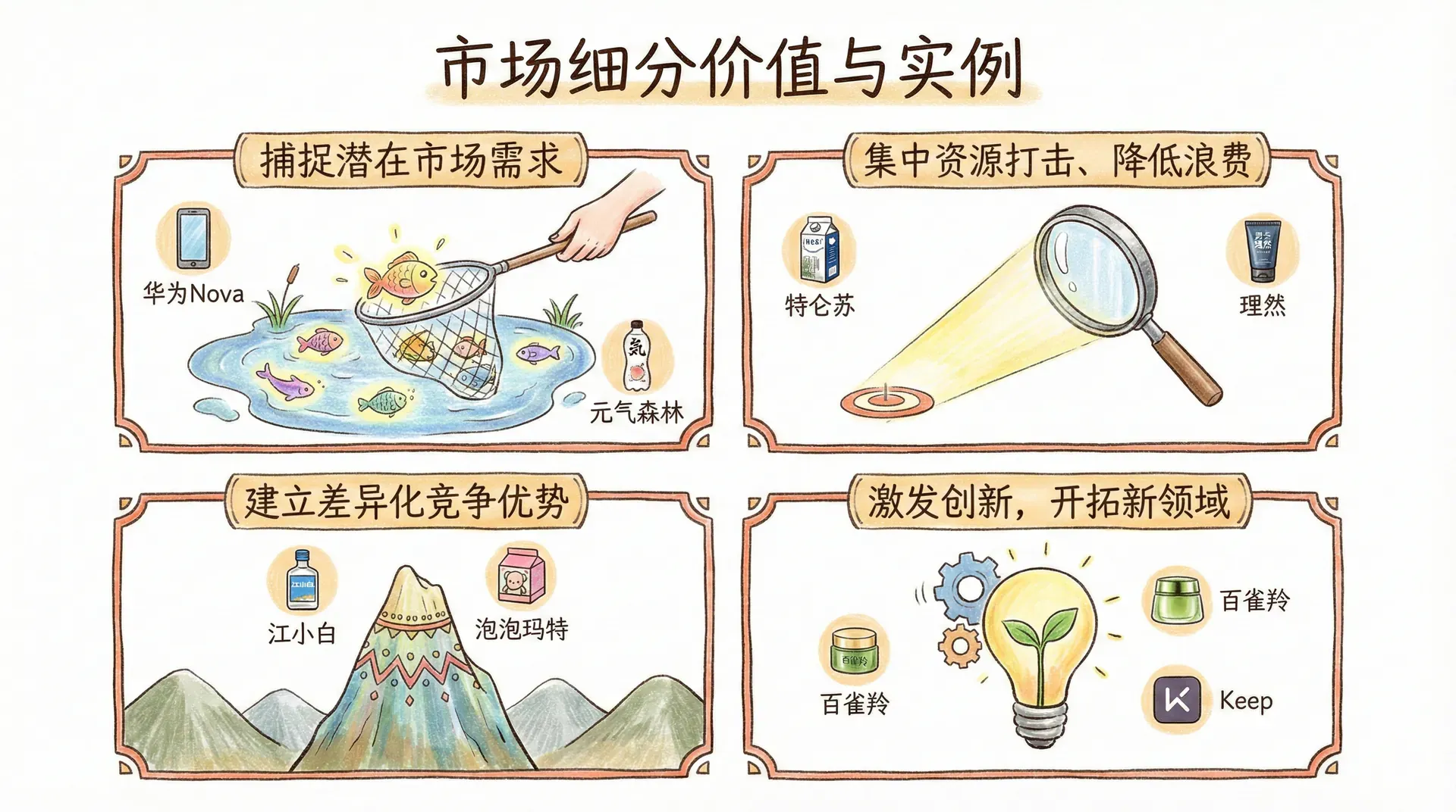 市场细分有助于企业发现潜在的“蓝海市场”。例如,百雀羚捕捉到中国女性护肤市场从“基础保湿”迈向“成分功效”细分的新趋势,抢先推出具有科技护肤成分的产品,满足细致化的皮肤护理需求。