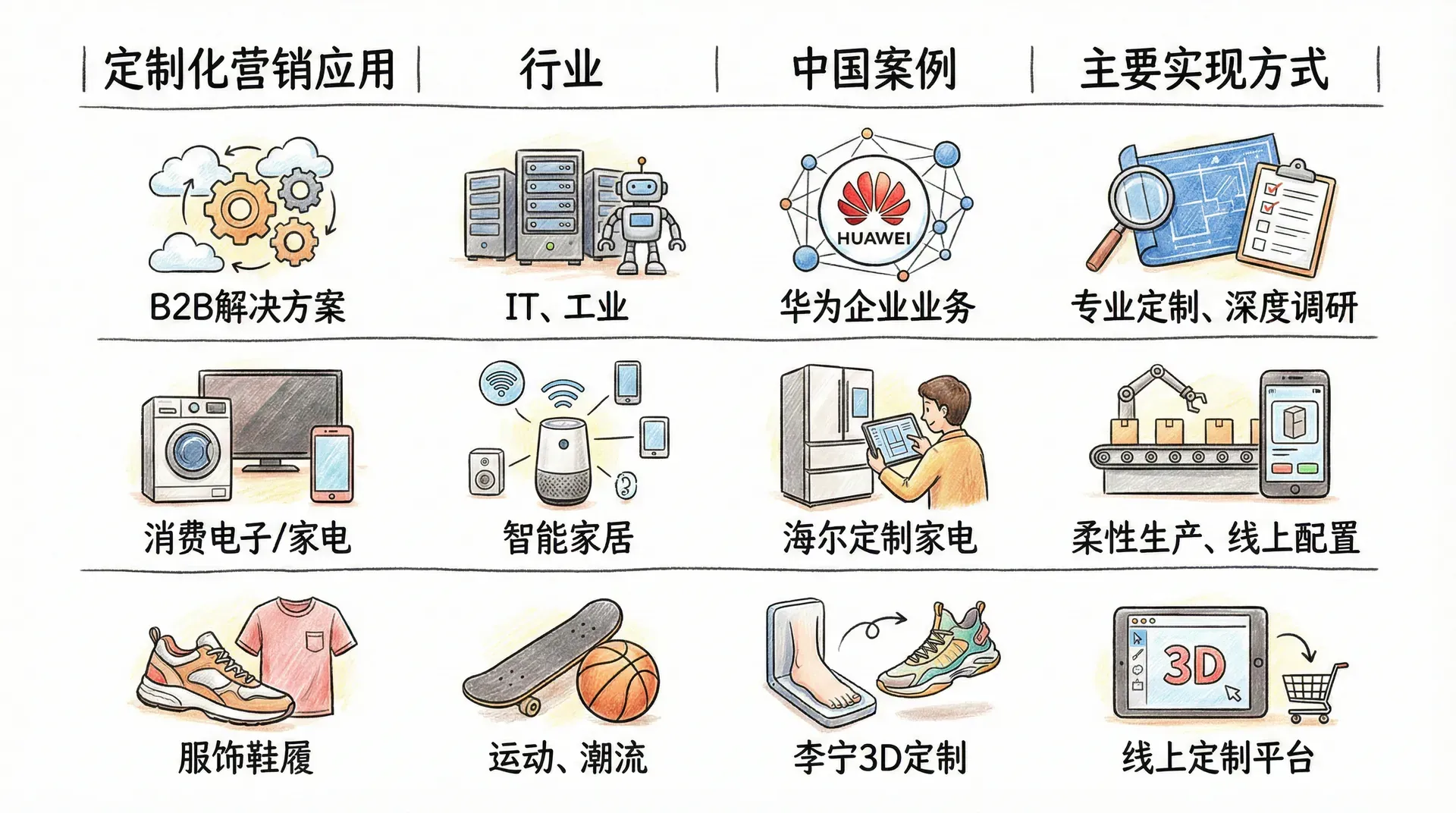 在中国消费市场,随着大数据、智能制造、柔性生产的普及,定制化营销正逐步渗透到更多行业。例如李宁“LI-NING 3D 定制”服务,运动爱好者可以通过线上平台自定义球鞋配色、签名和织带;海尔集团推广“定制家电”,用户可按户型尺寸、风格偏好定制冰箱、厨柜组合,满足了中高端家庭“专属设计感”的需求。