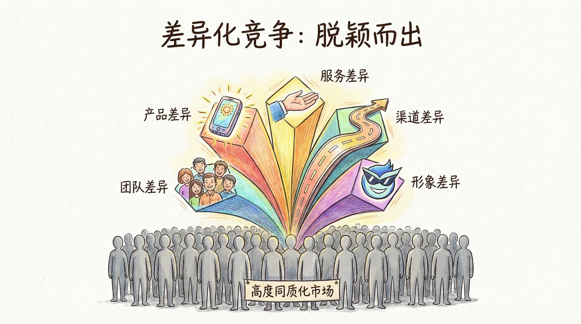 在高度同质化产品泛滥的中国市场,企业要想脱颖而出,必须找到并强化自身差异点。差异化不仅仅局限于产品本身,还包括服务、渠道、品牌形象乃至企业团队。
