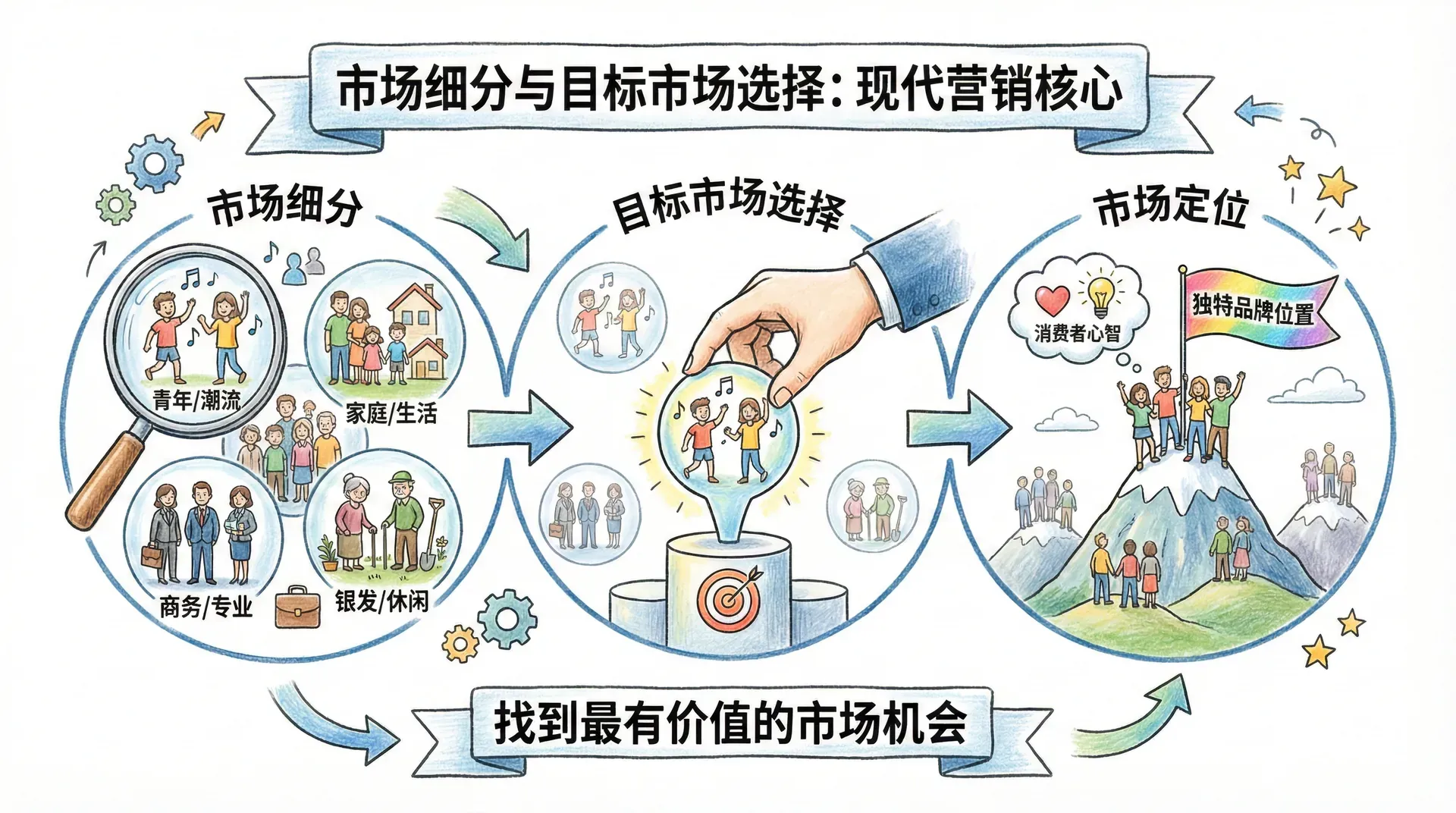 本内容系统介绍了市场细分、目标市场选择和市场定位的理论与实践。企业通过科学的市场细分,能够识别出最有价值的市场机会;通过合理的目标市场选择,能够集中资源服务最适合的消费群体;通过清晰的市场定位,能够在消费者心智中建立独特的品牌形象。这三个环节环环相扣,共同构成了企业营销战略的基础。在实践中,企业需要结合自身资源、市场特点和竞争环境,制定适合自己的细分与定位策略,并根据市场变化持续优化调整。