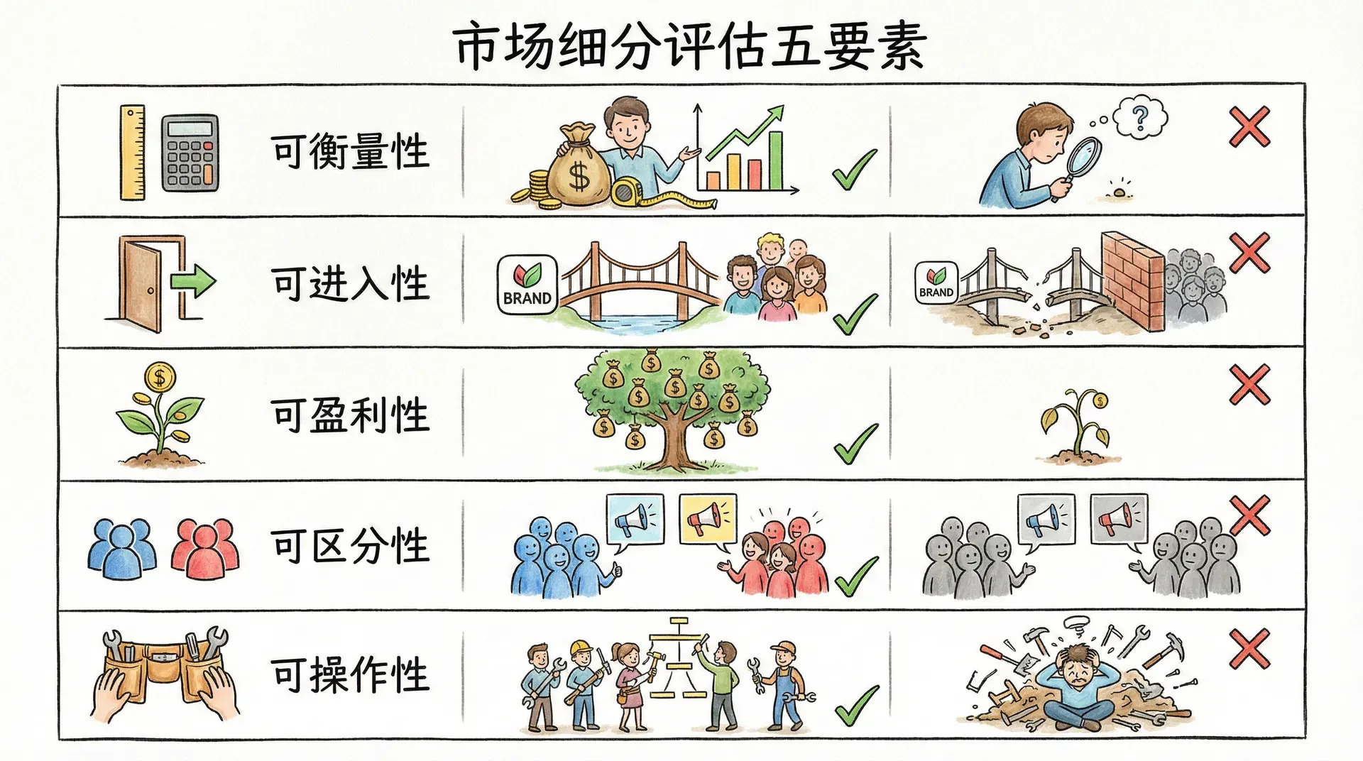 市场细分的核心不是“分得越细越好”,更需要在市场规模()和消费差异性()之间寻找平衡。理想细分市场满足以下条件: