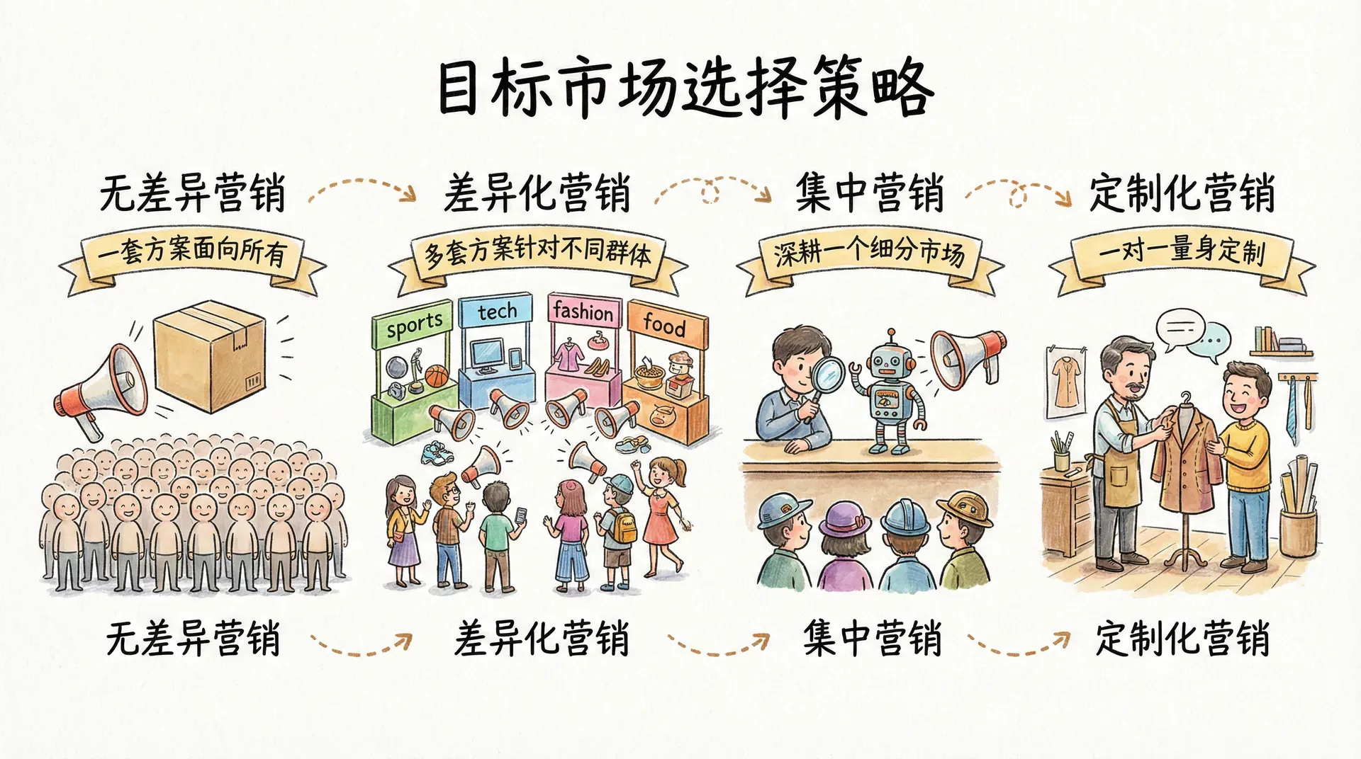 完成市场细分后,企业需要评估各个细分市场,并决定进入哪些市场。这个过程称为目标市场选择。企业可以采取的策略包括无差异营销、差异化营销、集中营销和定制化营销。