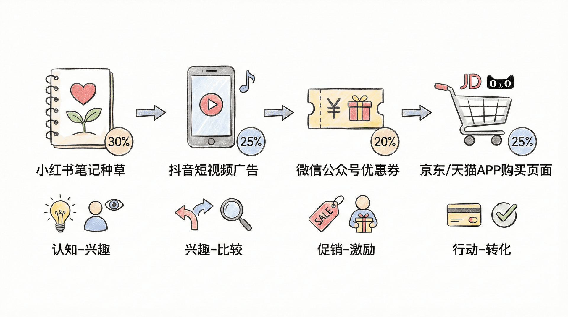 为此,越来越多中国企业采用多触点归因模型,以数据驱动方式量化不同触点对转化的实际贡献。以京东为例,他们构建了行为路径追踪系统,对用户自首触到最终购买的全链路进行分析,利用统计建模方法分别计算各环节的权重。典型权重分配如下图所示: