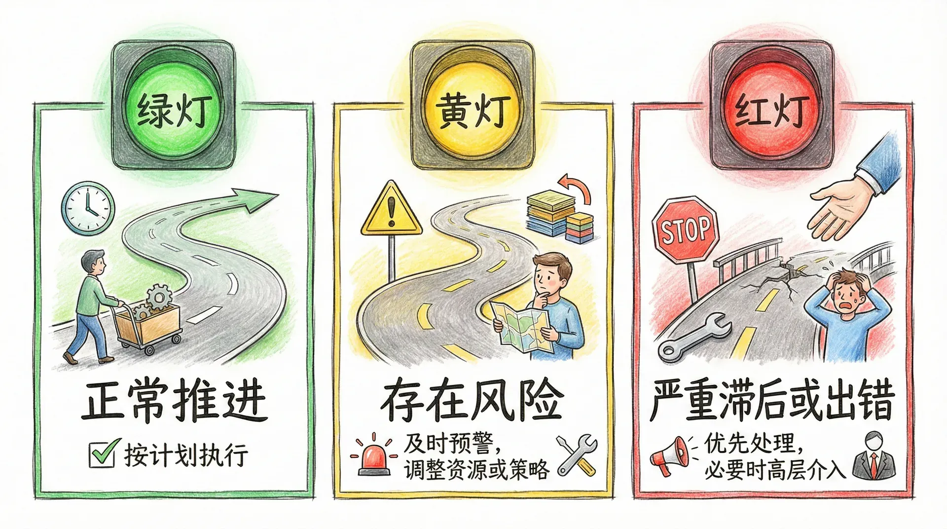 执行过程中,动态监控进度和快速响应问题至关重要。可以采用“红黄绿灯”管理法: