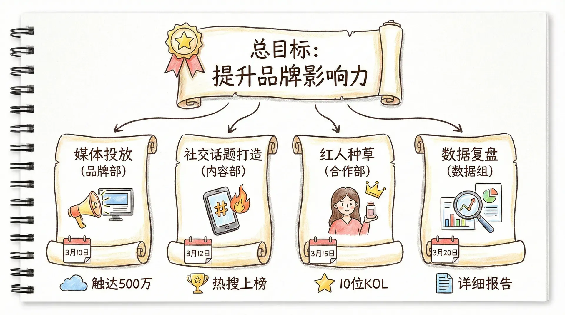 任务之间要明确依赖关系。例如,红人种草需要在发布会物料完备后启动;媒体投放则需与新品揭晓时间协调。同时,每一项任务都需确定负责人,对进度和效果全权负责,实现“任务到人,考核到点”。