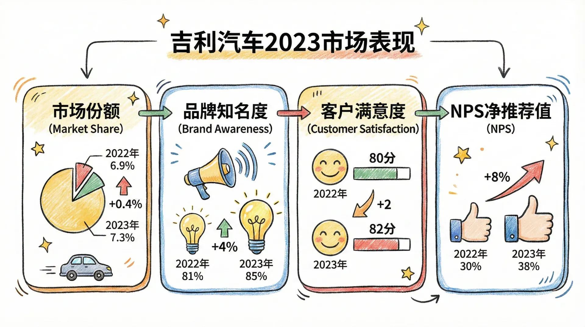 市场类指标衡量企业在市场上的地位与影响力,常用指标包括市场份额、品牌知名度、客户满意度和NPS等。例如2023年吉利汽车在国内乘用车市场部分绩效如下: