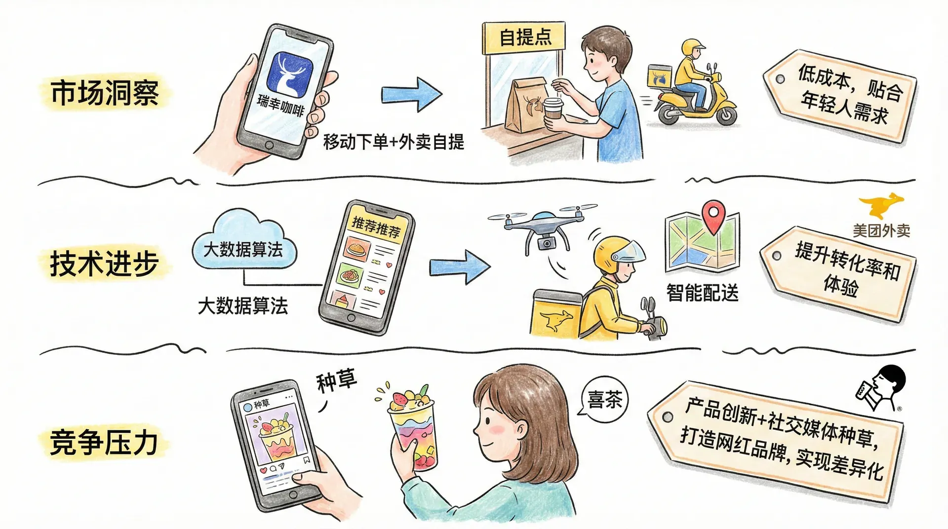 营销创新通常来源于三大动力:市场洞察、技术进步、竞争压力。以中国企业为例,可用下图总结驱动因素与代表案例: