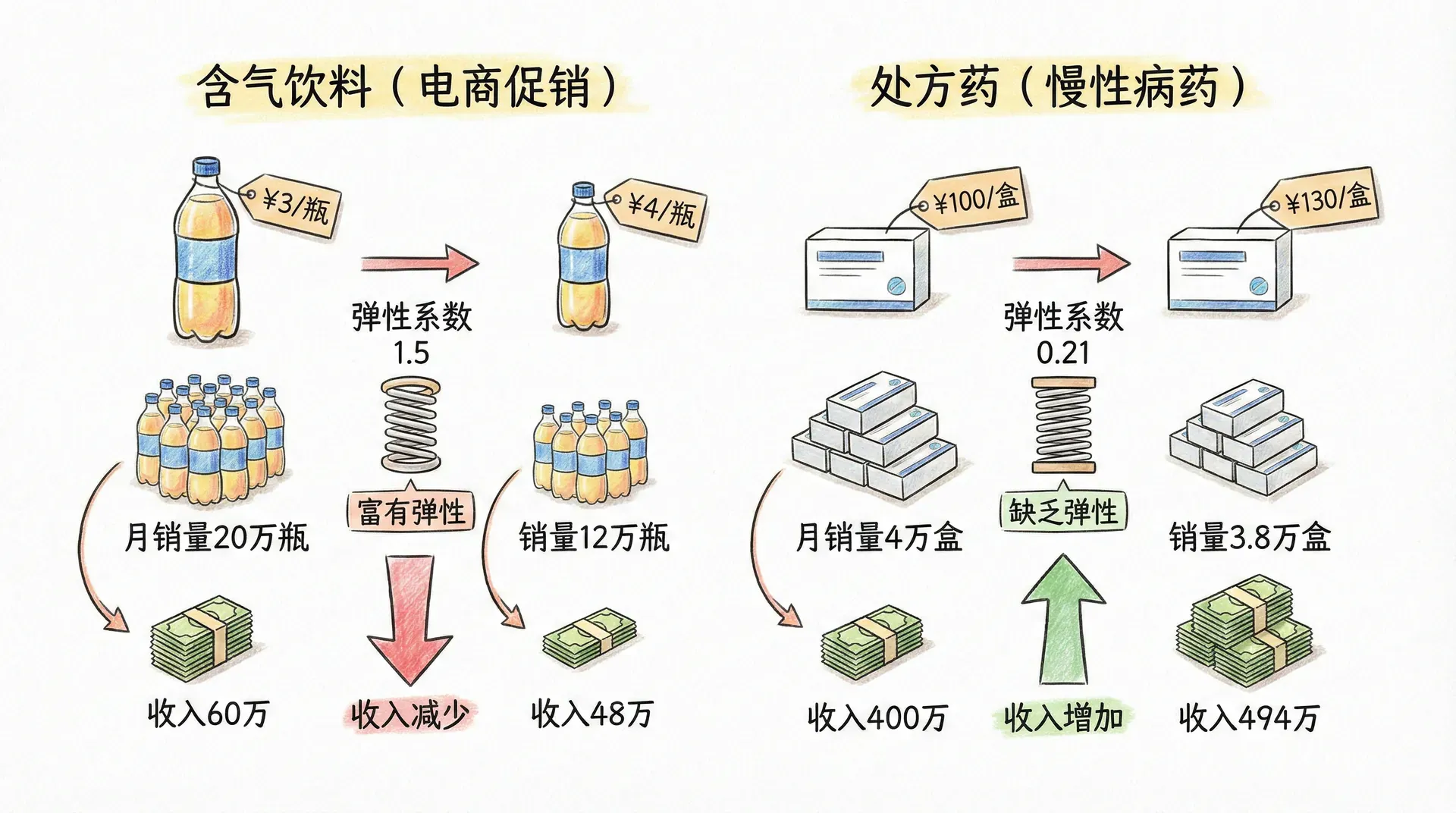 由上表可见,价格敏感型消费品(如饮料)提价易致销售大幅萎缩,而刚需、缺乏替代品的产品(如处方药)即使涨价,销量影响较小甚至总收入增长。