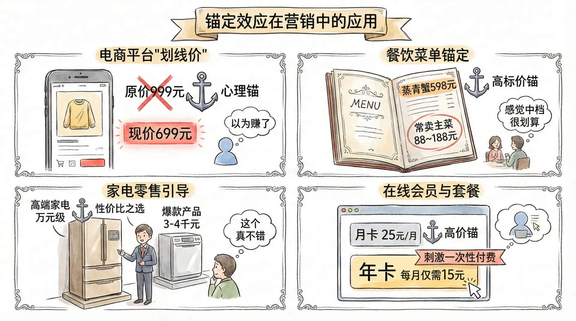 锚定效应(Anchoring Effect)指人在判断价格时,会受到首个出现价格(锚点)的强烈影响。企业可用高价作锚点,引导消费者接受后续“更合理”价格。