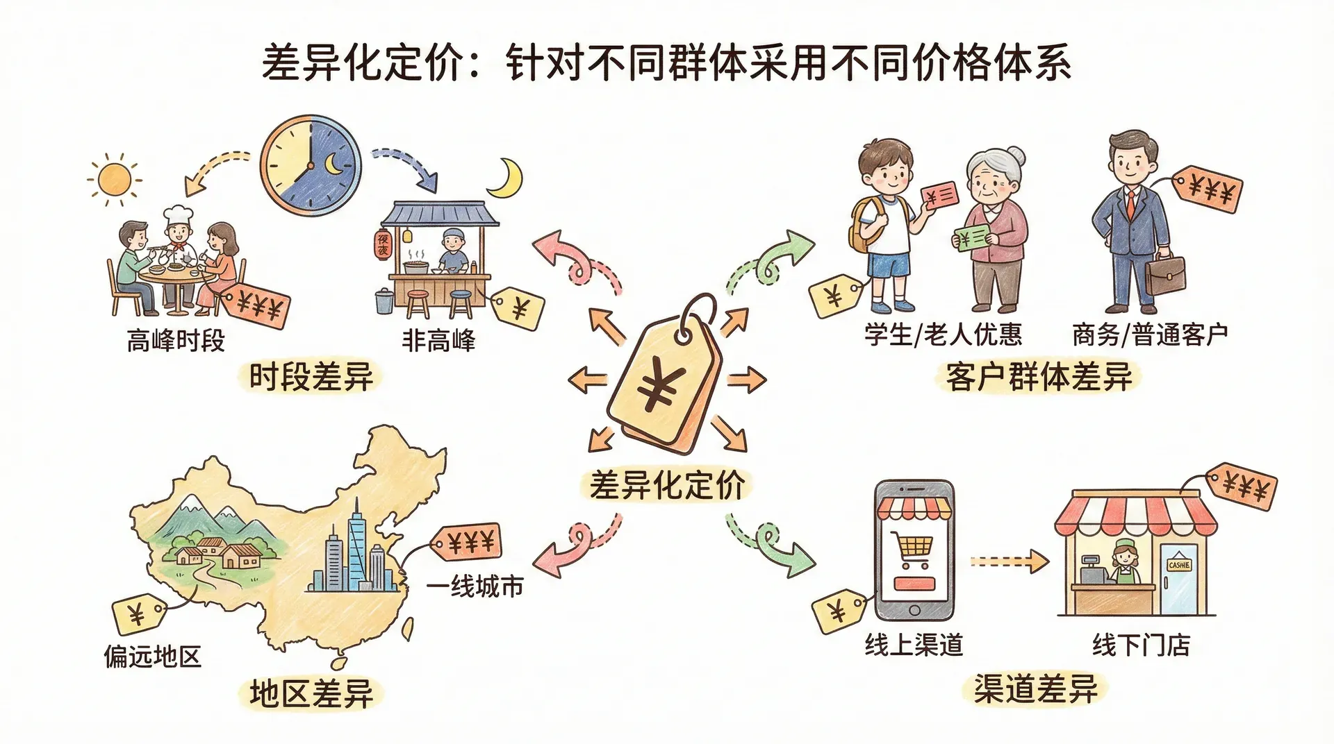 差异化定价指针对不同客户、市场、时段、地区或渠道,采用不同的价格体系。适合于需求弹性大、消费者分层明显的行业。中国常见细分策略如下: