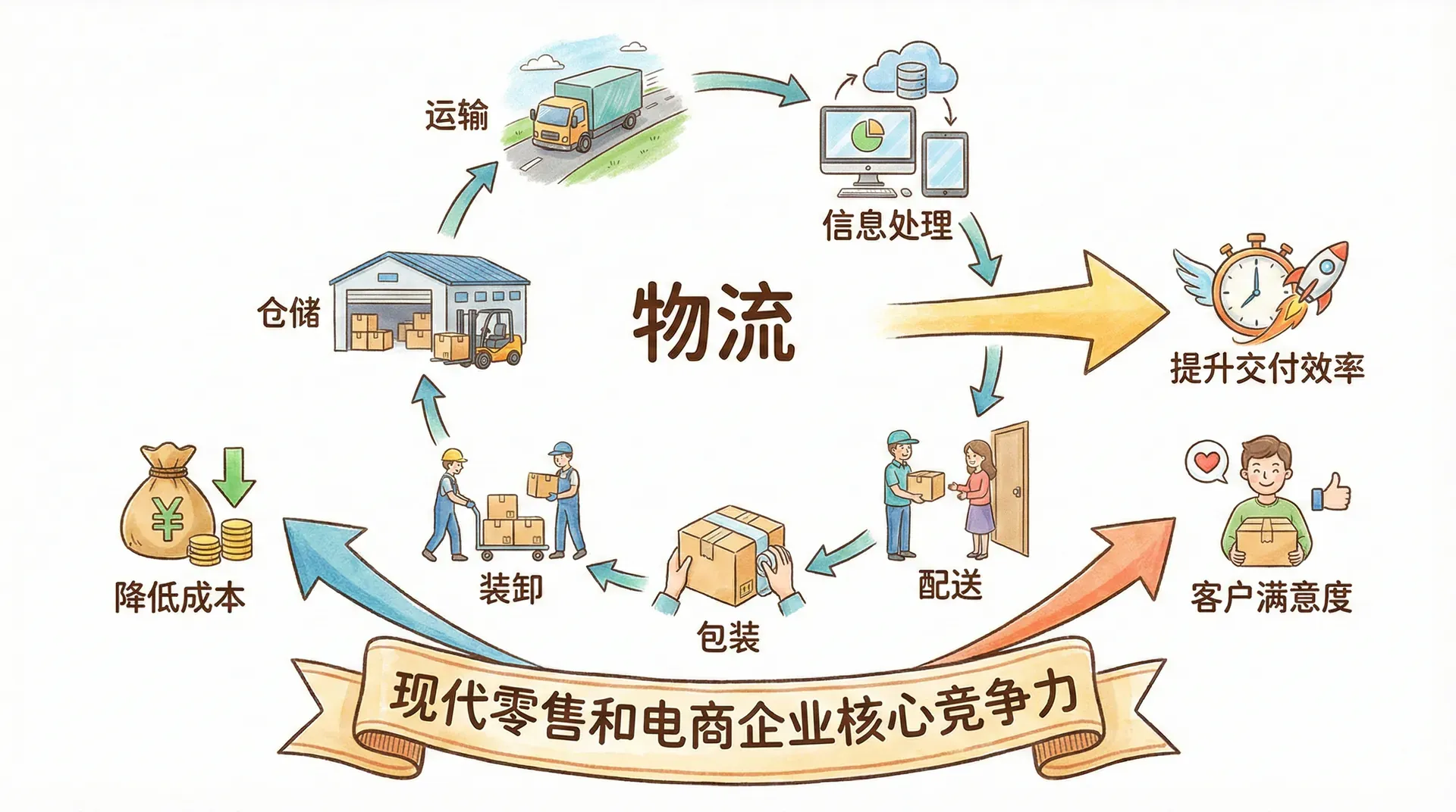 物流是实现商品空间移动与价值增值的重要活动,包括运输、仓储、装卸、包装、配送、信息处理等环节。一个高效的物流系统不仅能够大幅降低整体成本,还能提升交付效率和客户满意度,是现代零售和电商企业核心竞争力的重要组成部分。