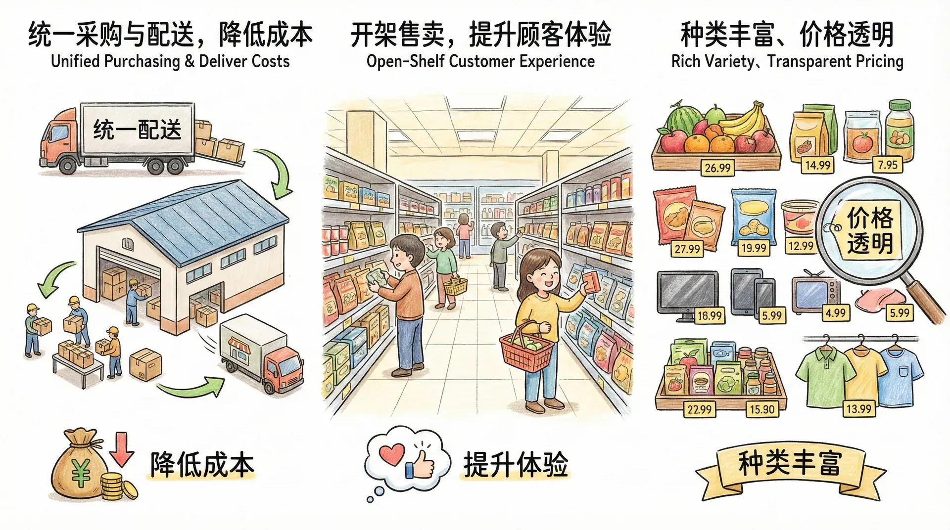 20世纪90年代,连锁超市在中国迅速普及。代表企业如联华、华联、物美等,逐步采用统一采购、配送和管理,提升了运营效率。超市引入开架自选,顾客可自由选购商品,提升了购物体验和效率。