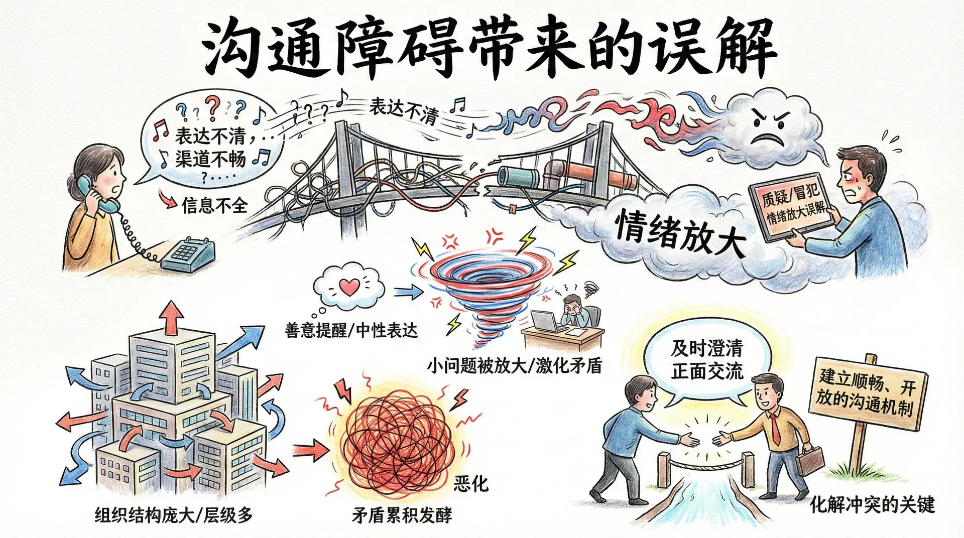 沟通障碍是导致组织内部冲突的重要诱因。许多看似无法调和的分歧,实质上往往源于信息传递中的偏差与误解。表达不清、语气难以体会、信息不全、沟通渠道不畅等,都极易造成本无恶意的话语被误解,从而让小问题被放大,激化矛盾。特别是在压力较大或团队关系紧张的环境下,彼此的敏感度提升,对方的善意提醒或中性表达也可能被解读为质疑甚至冒犯。组织结构庞大、部门层级多,更容易让误会随着时间累积发酵。