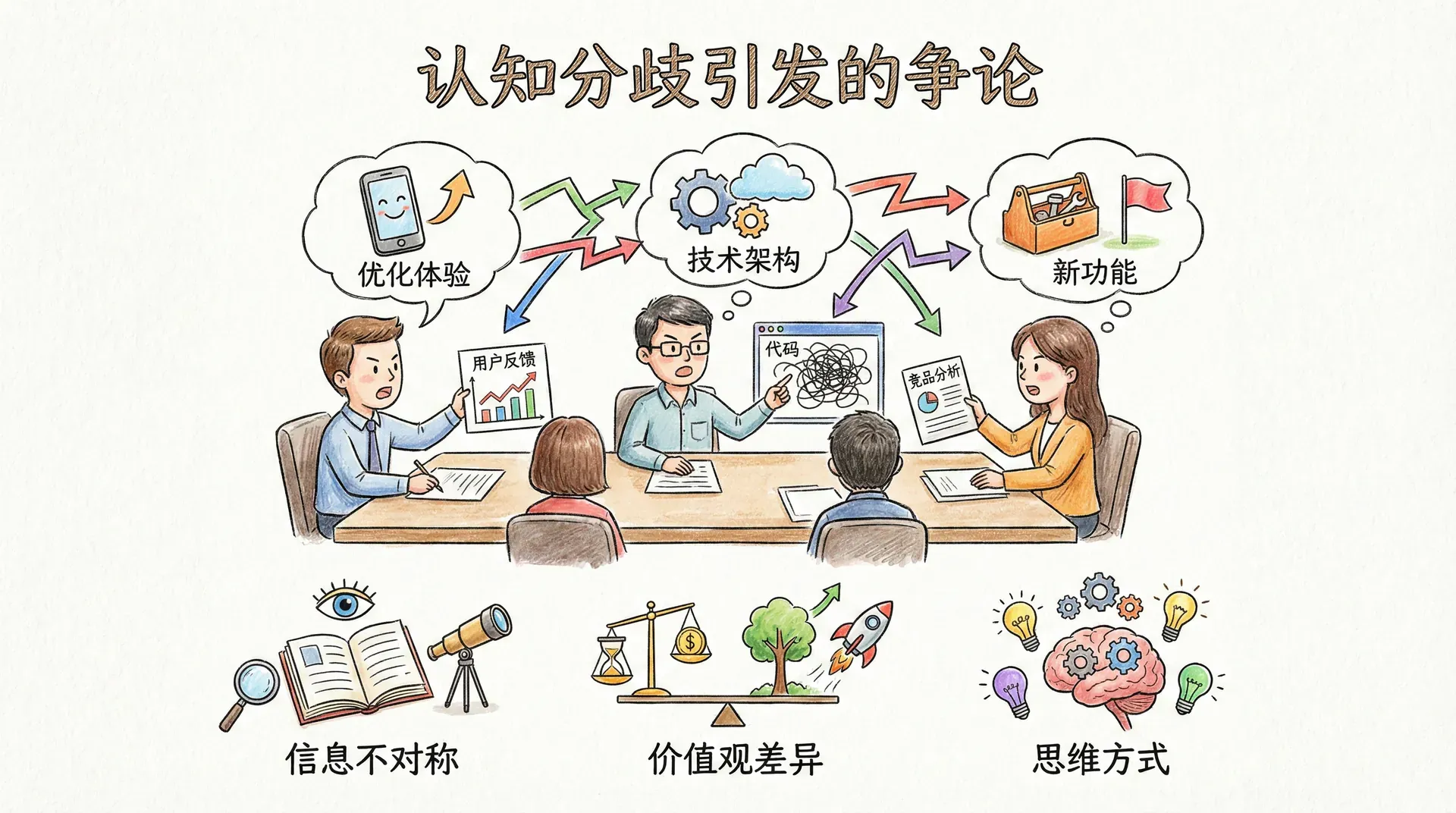 认知分歧的背后是信息不对称和思维方式差异。产品经理天天看用户反馈,最关注体验问题。技术负责人天天跟代码打交道,最了解技术债务。运营负责人天天研究竞争对手,最担心市场落后。每个人掌握的信息不同,关注的视角不同,自然会得出不同的结论。