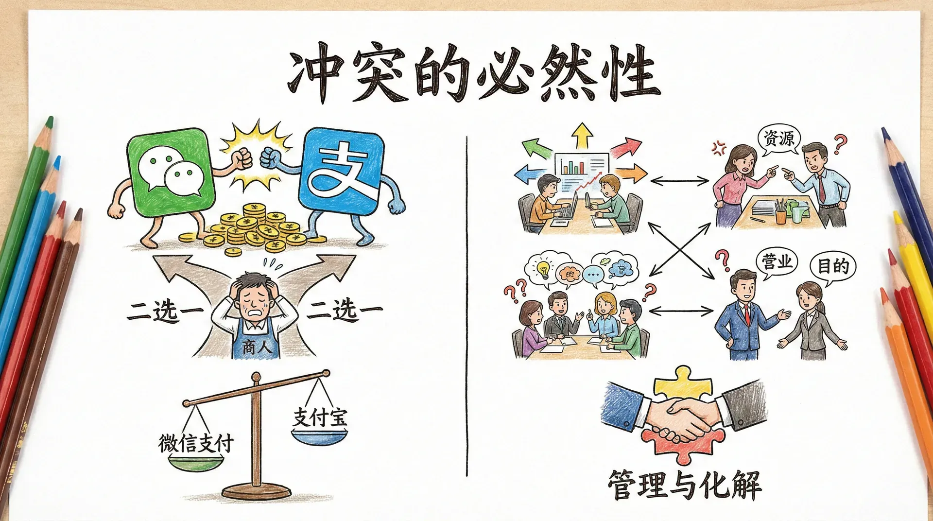 2018年,腾讯和阿里巴巴围绕移动支付市场展开了激烈竞争。微信支付和支付宝争夺线下商户,双方都拿出巨额补贴,要求商户"二选一"。很多商户陷入两难,既想要微信的流量,又离不开支付宝的体系。这场竞争一度非常激烈,甚至影响到了整个行业的生态。最终双方都意识到,过度竞争损害了用户体验,也消耗了双方的资源,逐渐转向了相对平衡的共存状态。这个案例说明,即使是行业巨头,也无法完全避免冲突,关键在于如何管理和化解冲突。