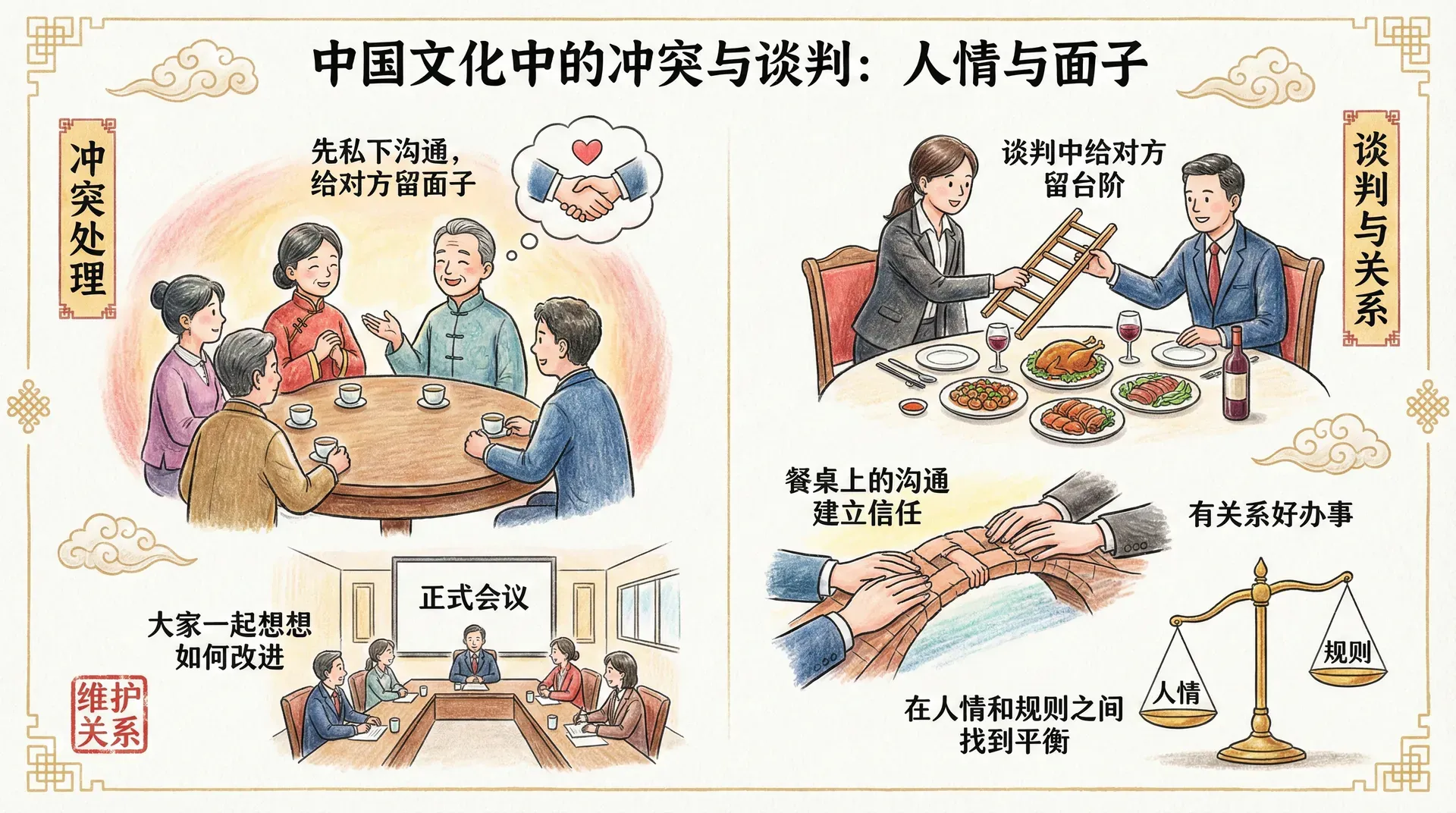 在中国文化中,人际关系和面子对冲突处理和谈判有着特殊的影响。西方文化强调就事论事,中国文化则强调人情关系。