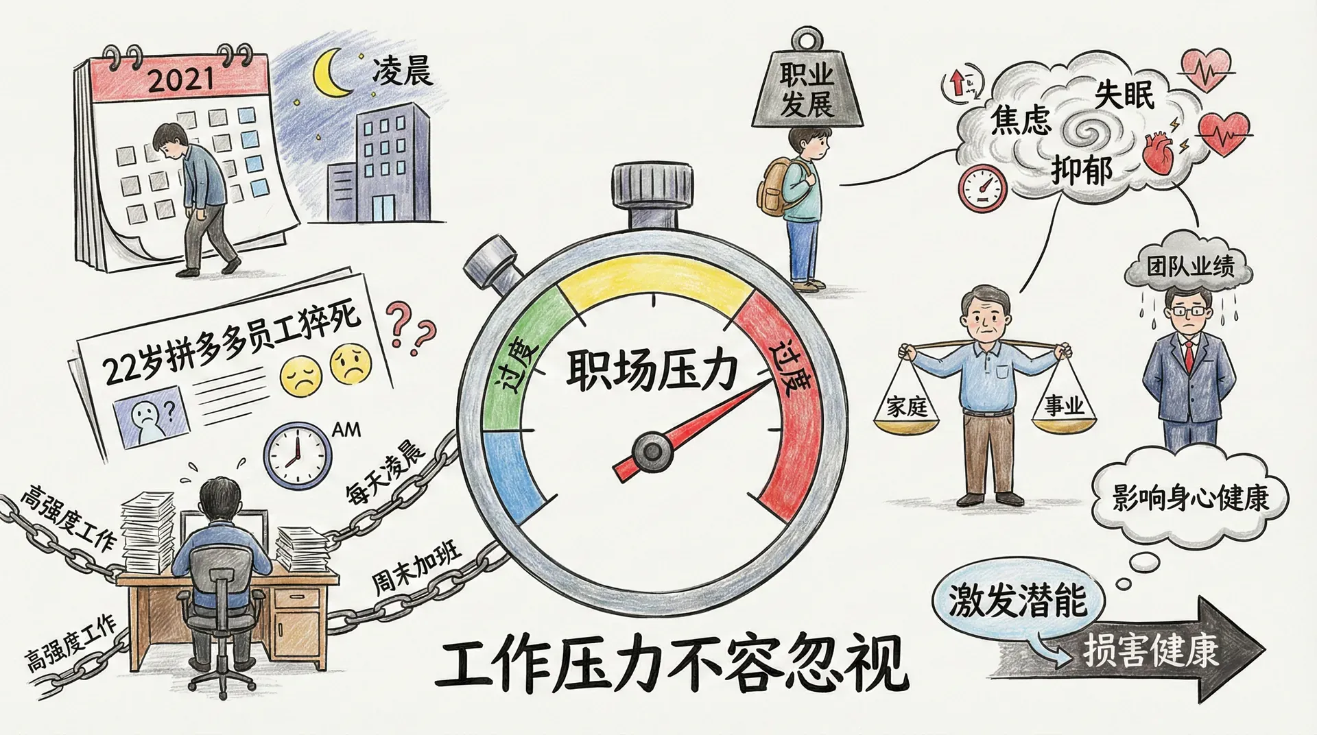 2021年初,拼多多一名年仅22岁的女员工在凌晨下班路上猝死,引发了社会对互联网行业加班文化的广泛讨论。这位员工的同事在社交媒体上透露,她几乎每天工作到凌晨,周末也要加班,长期处于高强度工作状态。这个悲剧不是个案,近年来职场人士因过劳猝死的新闻时有发生,工作压力已经成为不容忽视的社会问题。