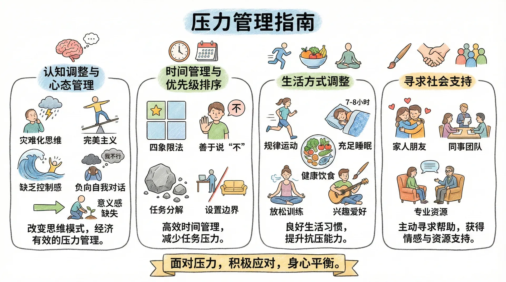 结合前文压力的来源和影响,我们需要从认知调整、时间管理、生活方式、社会支持等多个维度着手综合施策。不同压力类型(如任务压力、角色压力、环境压力、平衡压力等)也需要个性化的应对措施——比如任务压力可以聚焦于优先级梳理与任务分解,角色压力则需要明确职责、沟通协调。理解自己最大的压力点,有针对性地调整,方能实现真正的减压与成长。
