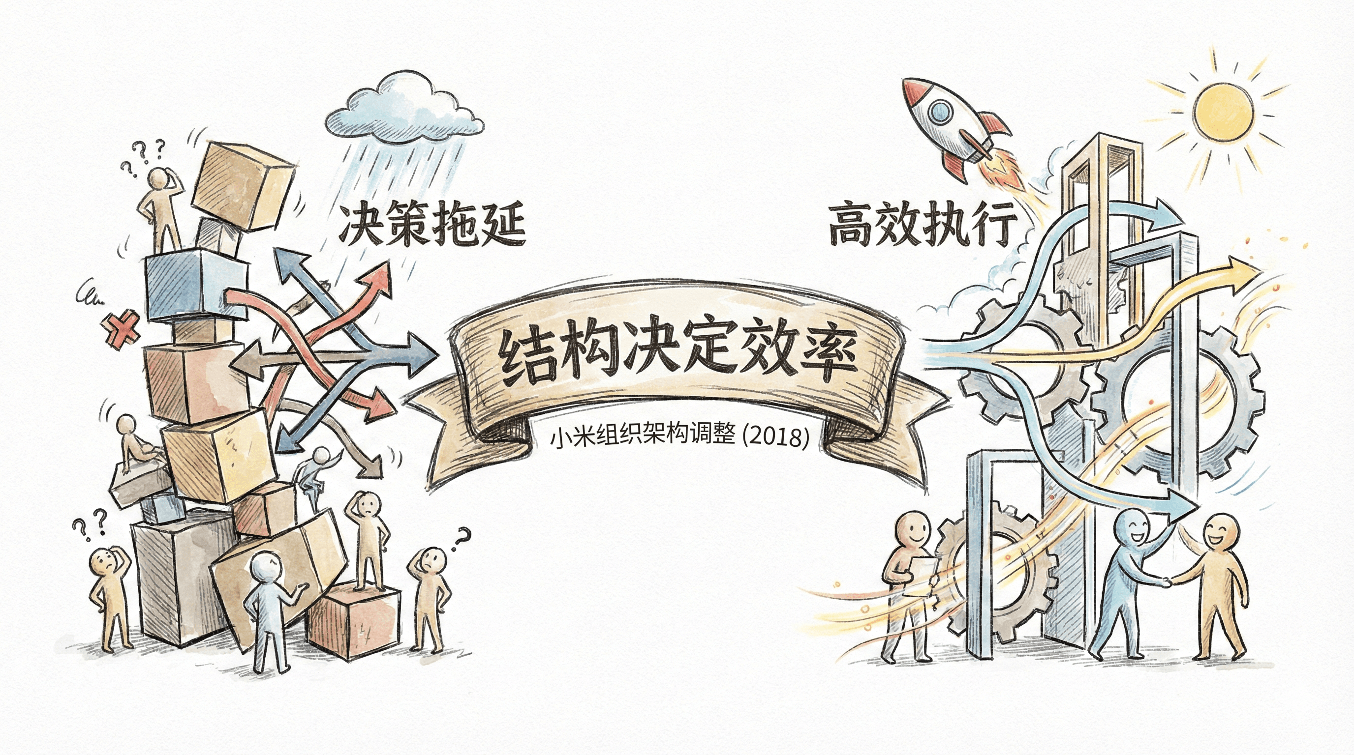 2018年,小米集团在香港上市后进行了一次重要的组织架构调整。雷军将原有的业务部门重组,成立了十个业务部,由十位高管分别负责,并且给予他们很大的自主权。同时,还成立了组织部、参谋部等职能部门来提供支持。这次调整的目的很明确:小米业务快速扩张,原有的组织结构已经跟不上发展速度,决策链条太长,部门之间协调困难。通过重组,让业务单元更独立,决策更快速,同时保持整体的协同。这次调整后,小米的业务增长明显加速,各个业务线都展现出更强的活力。