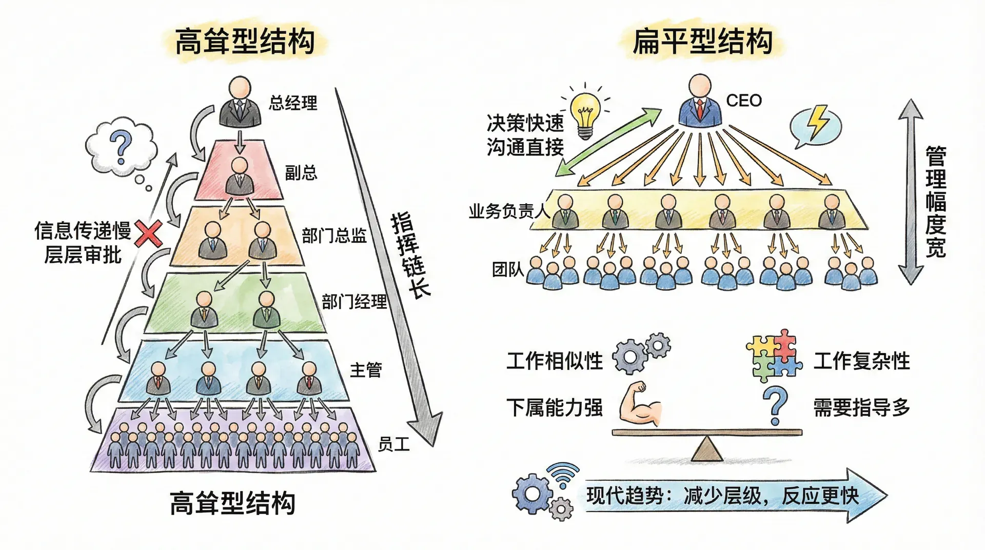 现代组织的趋势是减少层级,扩大管理幅度,形成更扁平的结构。这是因为信息技术的发展,让沟通更便捷,不需要层层传递;员工素质的提高,让自我管理成为可能;环境变化的加速,要求组织反应更快,不能在层级中耗费时间。