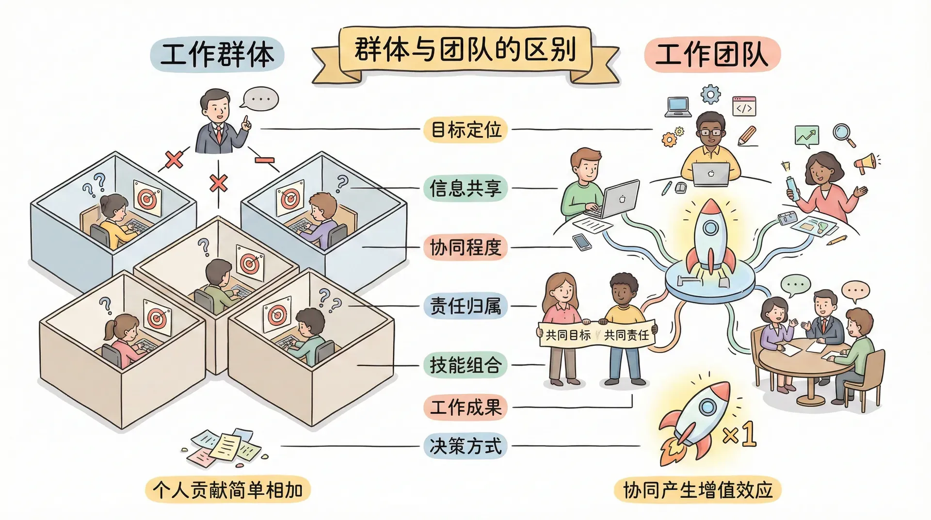 在现代组织中,单打独斗的时代已经过去。无论是产品开发、市场推广还是客户服务,几乎所有重要的工作都需要团队协作才能完成。但把一群人聚在一起并不等于组建了团队,很多所谓的"团队"实际上只是工作群体,成员之间缺少真正的协同。理解团队的本质特征,掌握团队管理的方法,成为每个管理者必须具备的能力。