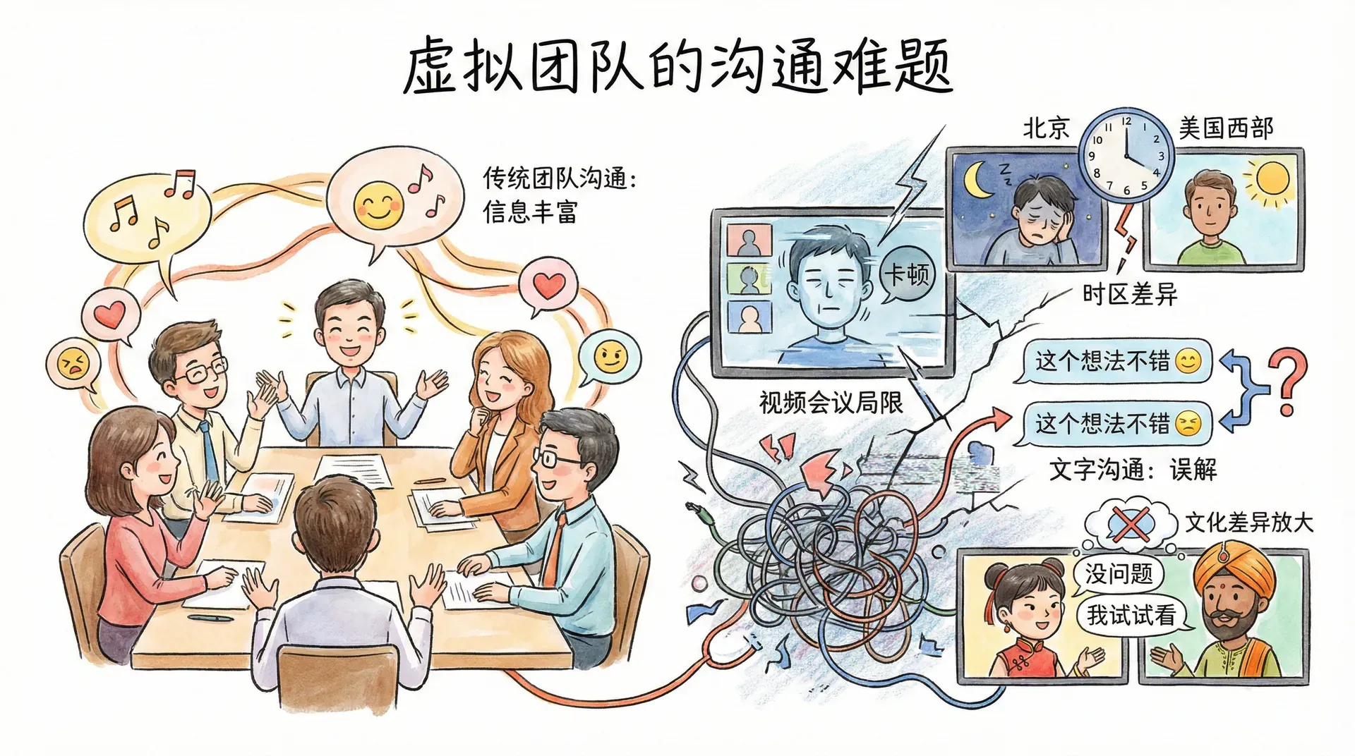 虚拟团队的沟通成本比传统团队高得多,看似省了差旅时间,实际上可能花费更多时间在澄清误解、重复说明、弥补信息缺失上。
