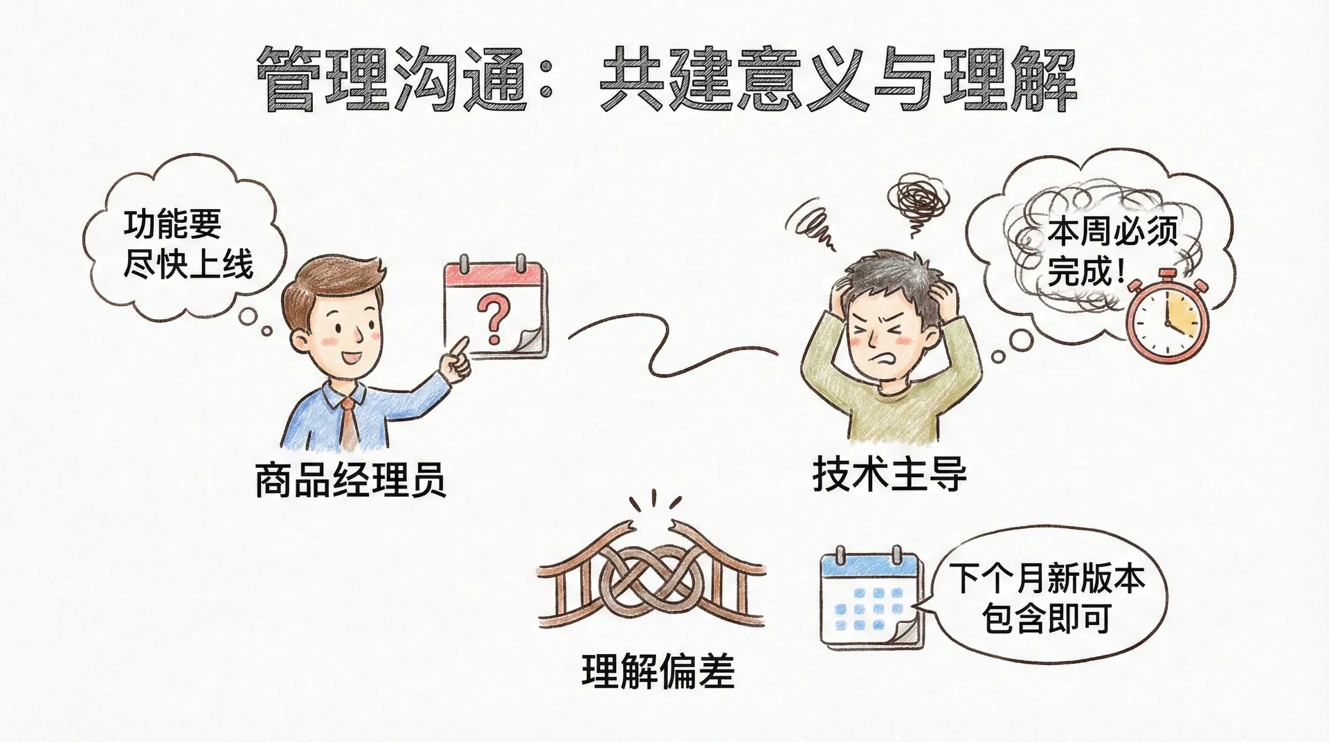 管理沟通不仅是信息的传递,更是意义与理解的共建过程。在实际工作中,很多沟通误差并非源于信息未传达,而在于双方对“意义”的理解偏差。例如,某科技公司的一位产品经理说“功能要尽快上线”,技术负责人可能理解为“本周必须完成”,而实际需求是“下个月新版本包含即可”。这种偏差在中国的各类企业每天都在发生,导致效率损失和关系紧张。