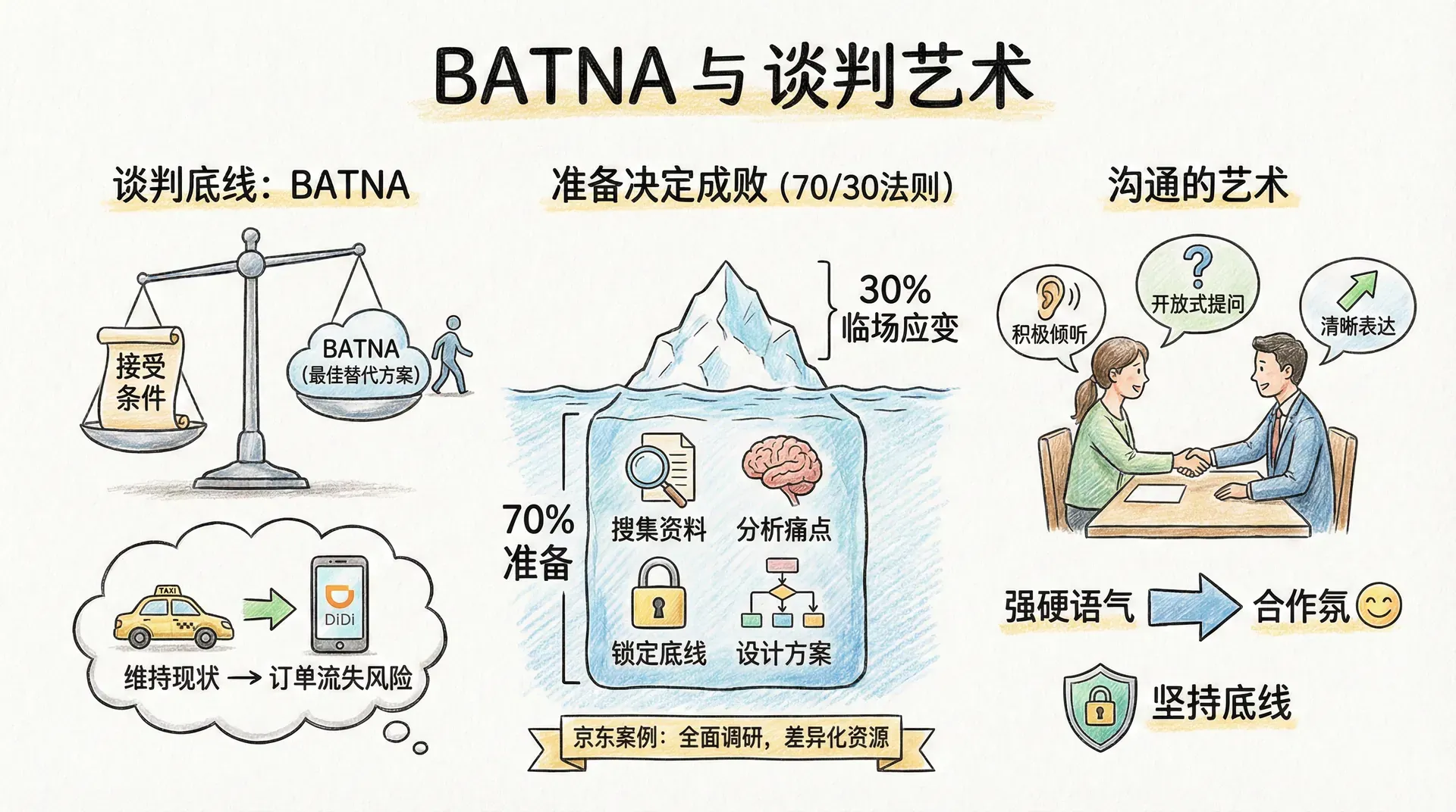 在谈判理论中,BATNA(Best Alternative To a Negotiated Agreement,最佳替代方案)是决定谈判底线和策略设计的核心概念。知晓自己的BATNA,可以准确判断是否接受对方条件;分析对方BATNA,能灵活调整让步空间。例如,滴滴早期与出租车公司合作时,对方的BATNA是“继续维持现状”,对平台需求低。滴滴通过试点让部分司机感受订单和收入提升,侧面提升了平台吸引力、弱化了出租车公司的BATNA——一旦不合作将面临订单流失。此调整后,驾驶员和公司的态度明显变化,合作谈判也豁然开朗。