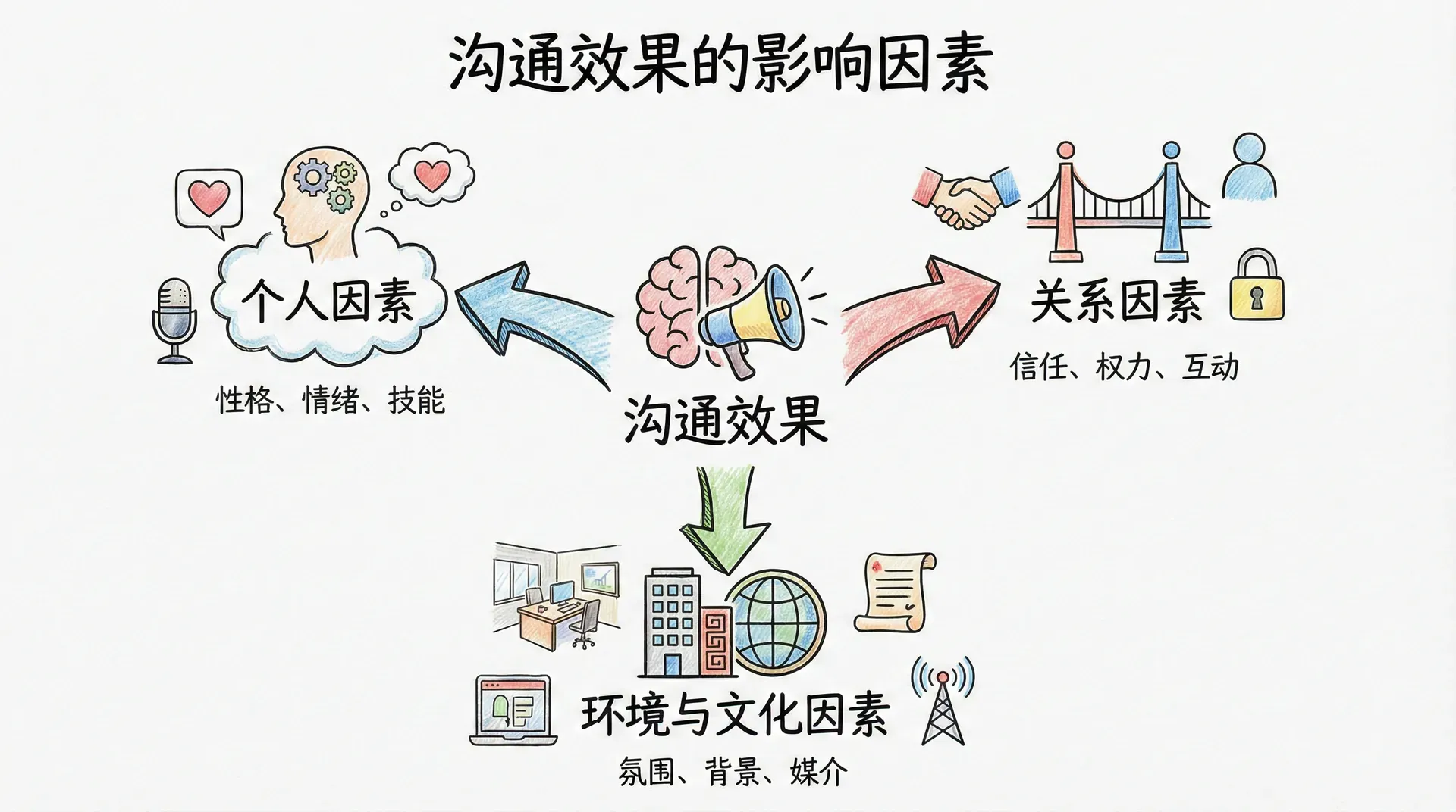 沟通效果受多重因素影响,主要可分为三大类:个人因素、关系因素以及环境与文化因素。科学理解这些影响,有助于管理者诊断实际沟通中的障碍、选择合适的改进策略。