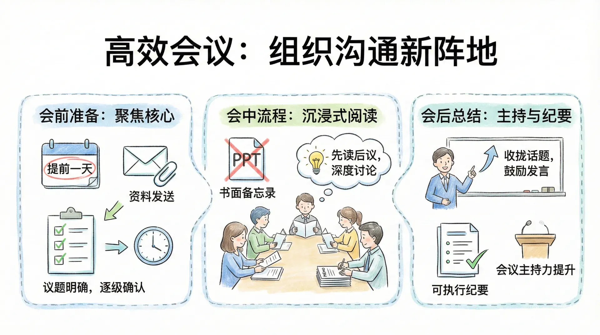 而会议则是组织沟通的另一大阵地。高效会议强调:议题明确、资料提前准备、流程把控、现场总结。京东和字节跳动等公司非常重视会前准备,例如要求所有相关材料会议头天发送并逐级确认,方便参会人员聚焦核心问题。此外,越来越多中国企业学习亚马逊的“沉浸式阅读”模式,要求大型决策会摒弃PPT,改用书面备忘录,会前先安静阅读,再讨论,不仅提升讨论深度,也减少了形式主义。阿里则专门为中高层开设会议主持力课程,包括如何收拢话题、鼓励新人发言、形成可执行的会议纪要等。