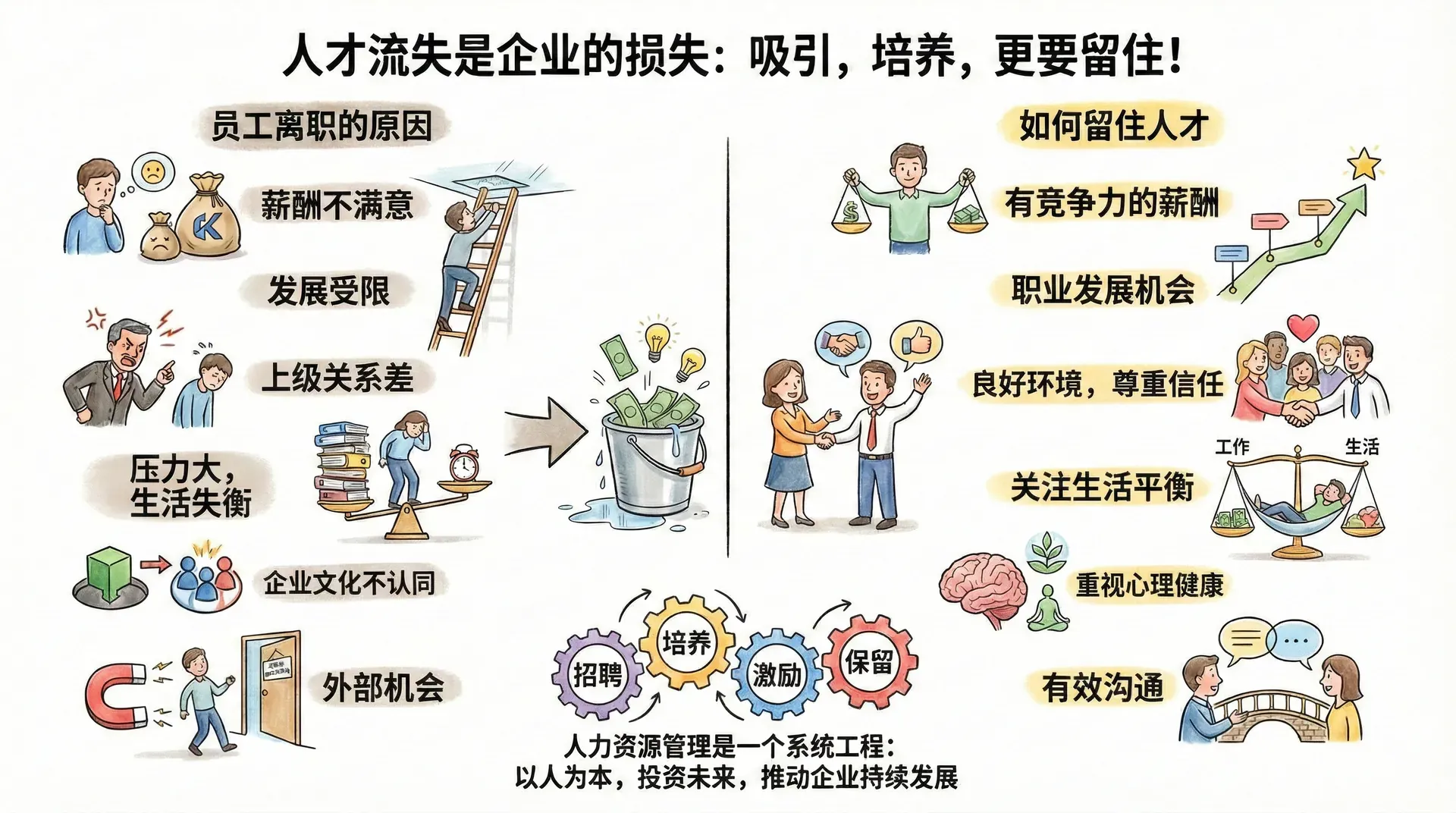 人才流失往往不是突然发生的,而是长期问题积累的结果。当优秀员工提出离职时,往往已经考虑很久,挽留的成功率很低。企业要做的是预防,而不是挽留,要在日常管理中关注员工感受,及时解决问题,避免人才流失。