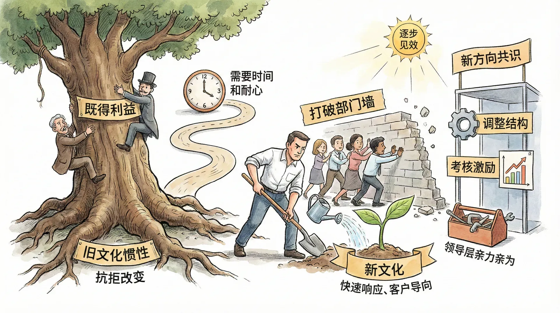 综上,文化变革需“领导驱动+机制落实+长期坚持”三管齐下,才能突破惯性、平衡利益、实现真正的文化焕新,为组织后续发展提供坚实内核支撑。