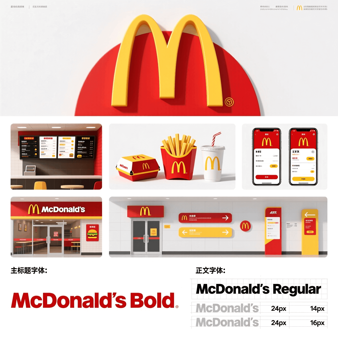 麦当劳的设计系统是一个很好的例子。麦当劳的设计原则围绕着“快乐”和“效率”这两个核心价值,所有的设计决策都服务于这两个目标。他们的视觉语言非常明确:标志性的金色拱门 Logo、红色和黄色的配色方案、简洁现代的字体、充满活力的图像风格。 麦当劳的组件库包含了从菜单板到包装盒、从手机应用到门店招牌的所有设计元素,这些组件都遵循相同的设计规范,确保无论消费者在哪里接触麦当劳,都能获得一致的体验。麦 当劳的样式指南详细规定了如何使用这些元素,比如红色应该用于哪些场景,黄色应该用于哪些场景,Logo 的最小尺寸是多少,等等。这种完整的设计系统确保了麦当劳在全球数万家门店中都能保持一致的品牌形象。
