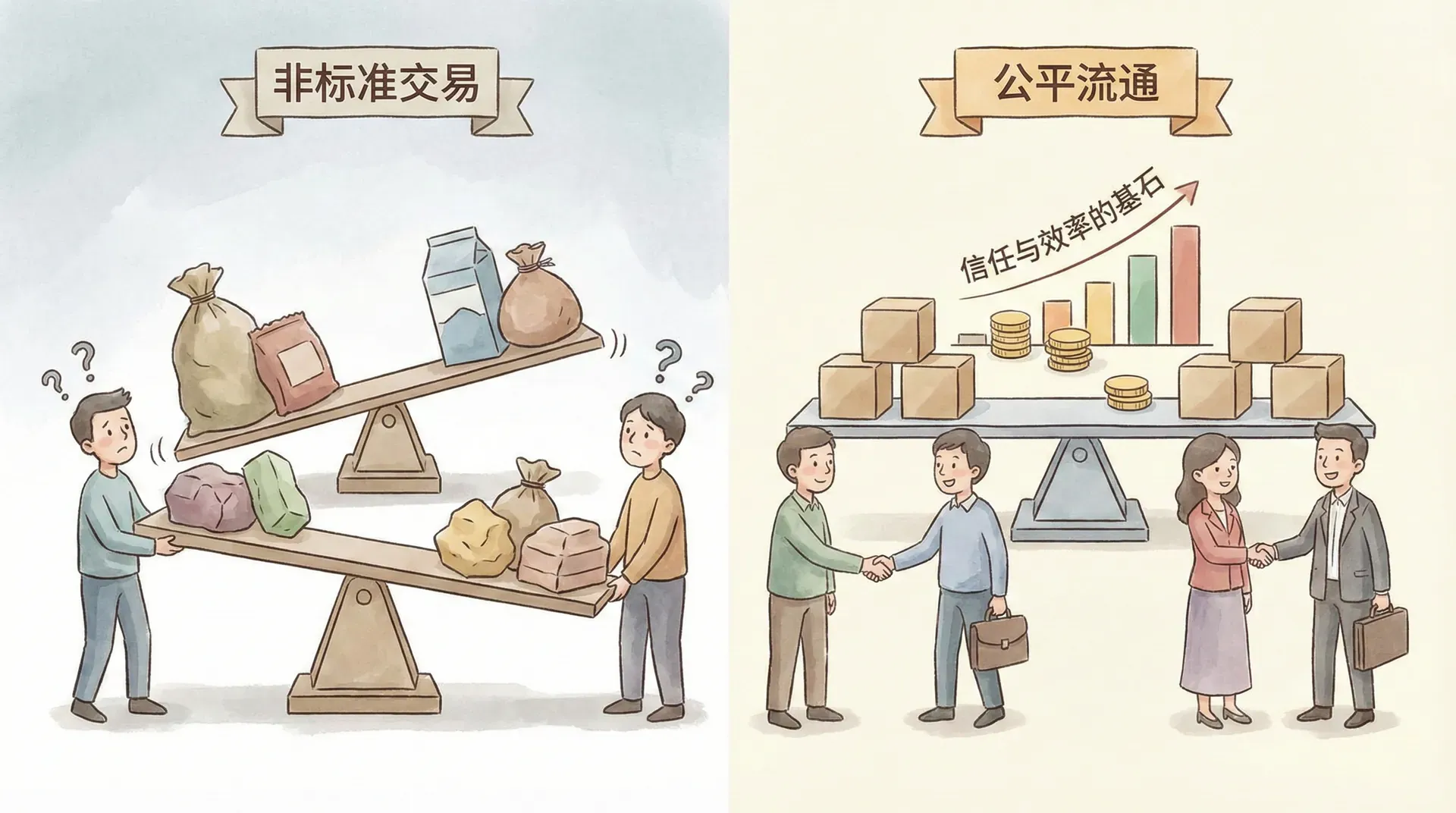 在古代,人们通过物物交换进行贸易,但这种方式效率很低。如果你有鱼想换苹果,你需要找到恰好想要鱼的人。货币的出现解决了这个问题,但更重要的是,标准化的度量衡让交易变得可能。如果我想买你的粮食,我们需要就数量达成一致。