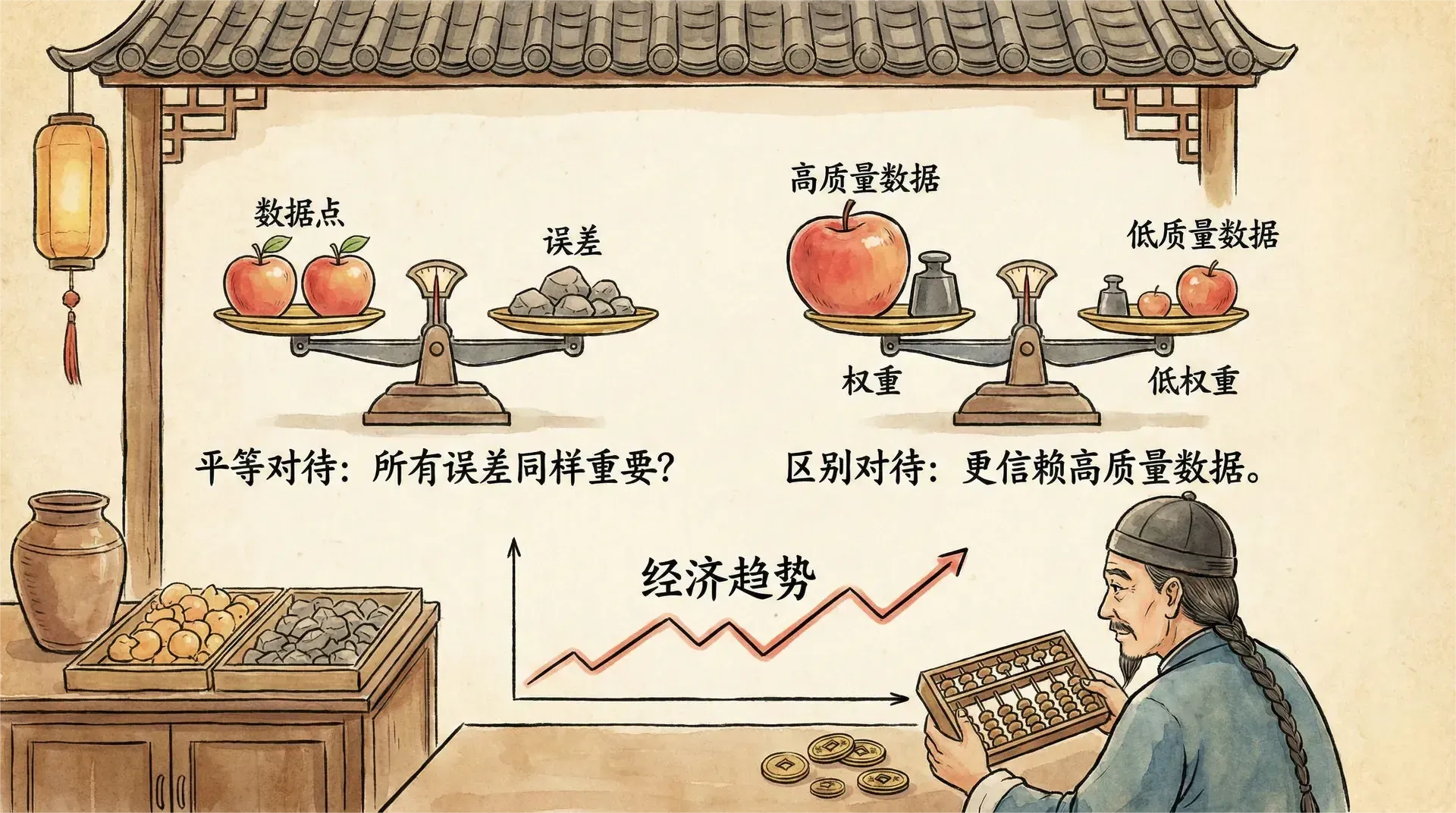 在经济学实际建模中,权重的选择核心是对观测误差方差的理解。如果已知第 个观测的误差方差为 ,那么最优权重应取为