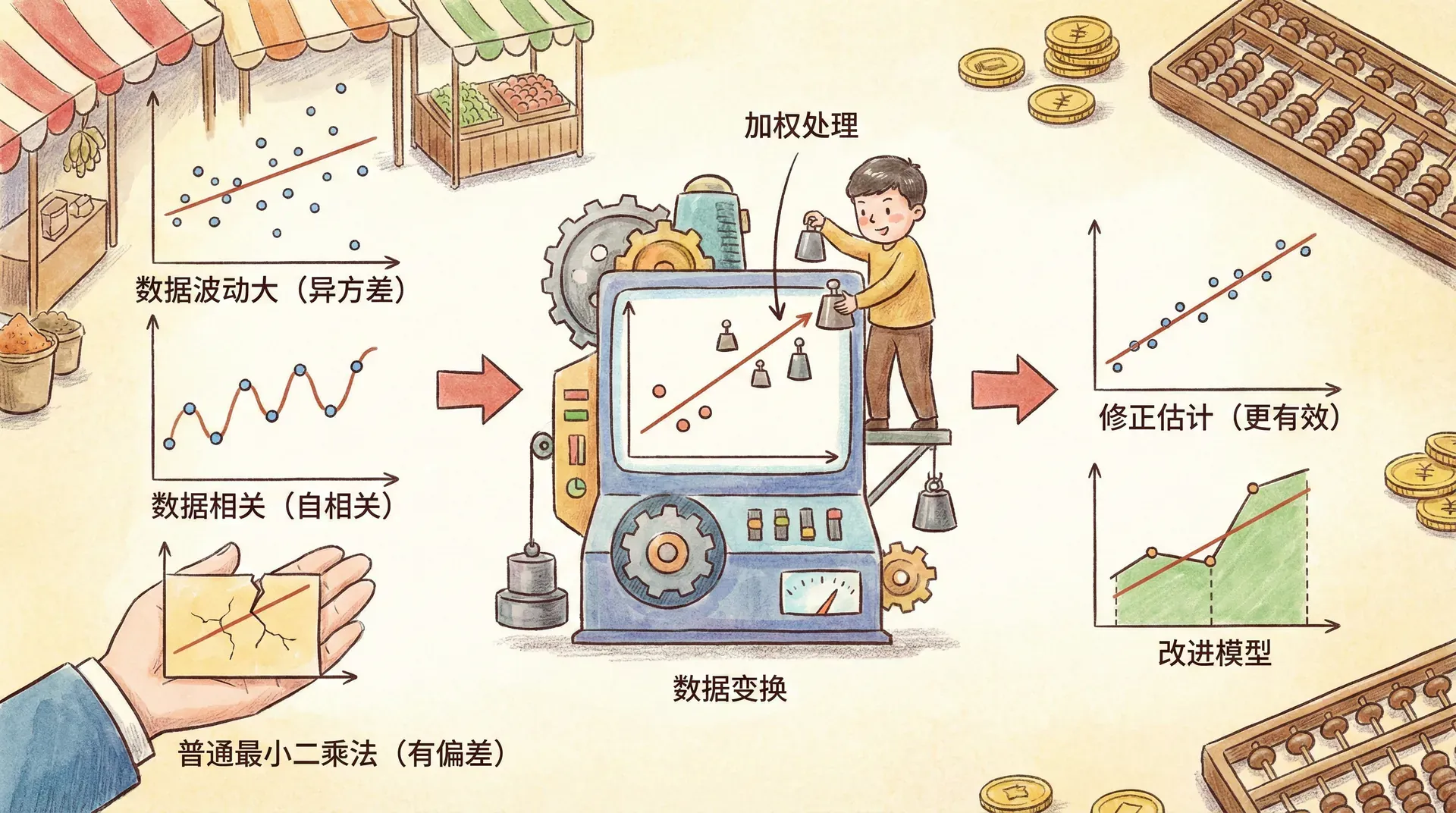 广义最小二乘法(GLS, Generalized Least Squares)的核心思想,是通过对数据进行适当的线性变换,将原本不满足经典回归诸如同方差、无自相关等假设的数据,转化为满足这些假设的新数据。形象地说,这就像给每个观测值配上专属的“放大镜”或“缩小镜”,针对不同误差结构加以校正,使得分析更加精确。