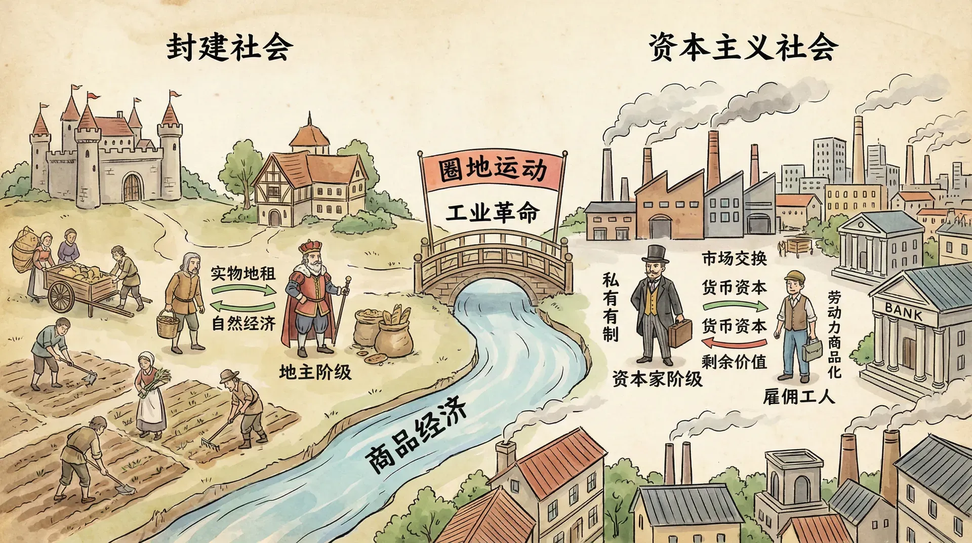 从封建到资本主义的转变不仅改变了劳动力的来源,也孕育了新的社会阶层。新兴的工业资产阶级在历史进程中逐步挣脱了封建特权和手工业行会的约束,成为工业化和现代市场经济的主导力量。他们的兴起依赖于多种历史机遇,比如殖民扩张、商业革命、金融创新等;但值得注意的是,这一过程往往既包含合法市场竞争,也掺杂着军事武力、法律暴力甚至掠夺行为,与他们谴责的封建特权方式并非截然不同。