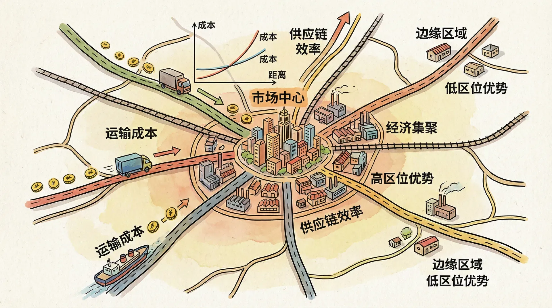 空间经济学强调,在进行生产、分销或消费等决策过程中,经济主体必须将时间与空间两大维度的优化同时纳入考量,这样才能实现资源配置的最大化效益,而绝不能只聚焦单一维度。