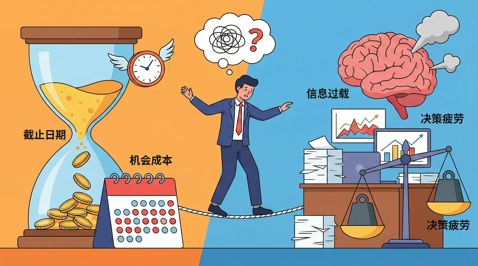 另一大影响认知努力的因素是“时间压力”。当你被要求在极短时间内完成高难度思维时,心理压力既来自外部的时限,也来自内部记忆随时会遗失的信息焦虑。